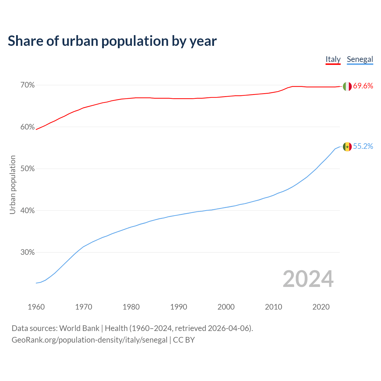 From 2004 to 2024, the share of urban population changed from 67.5% to 69.6% in Italy and from 41.6% to 55.2% in Senegal.