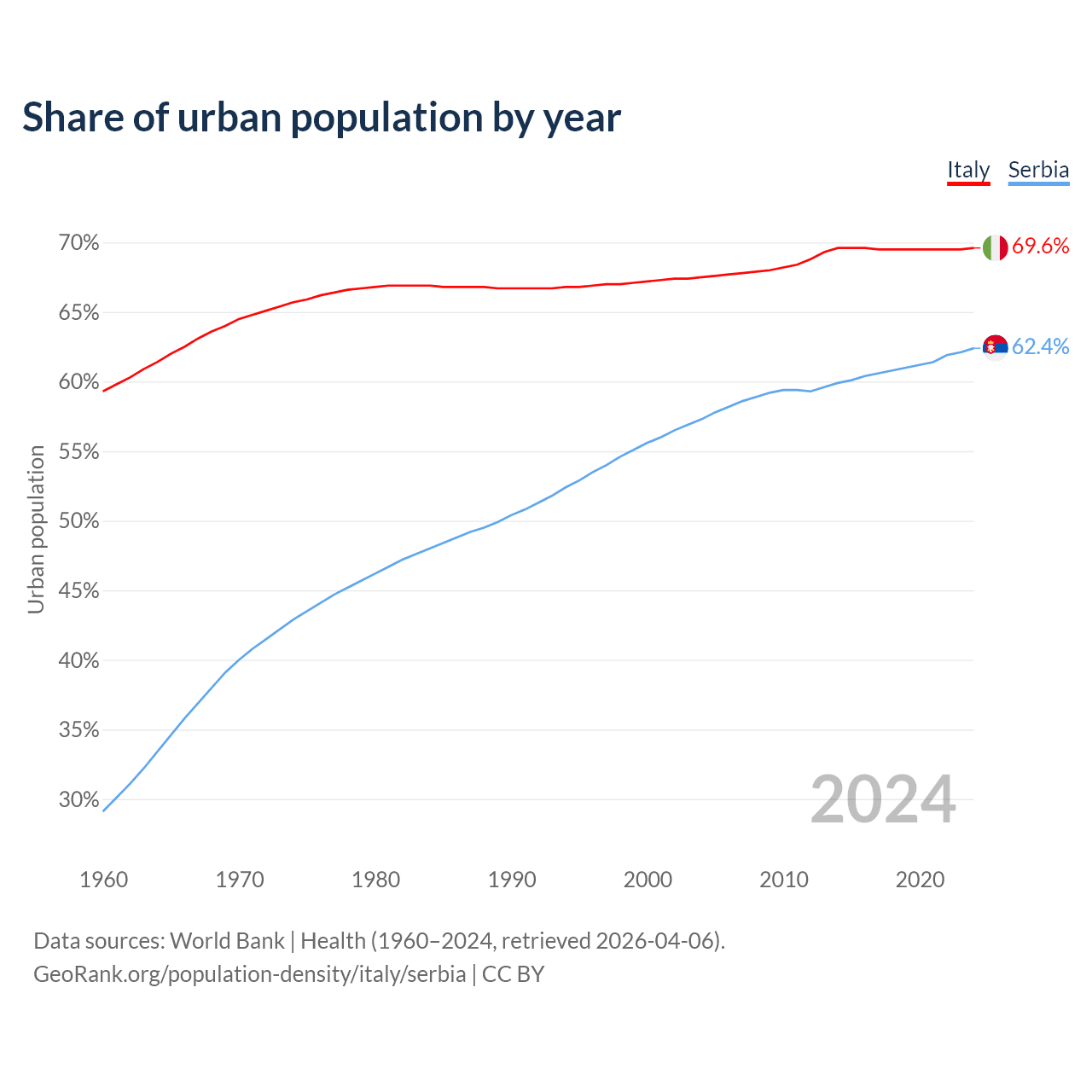 From 2004 to 2024, the share of urban population changed from 67.5% to 69.6% in Italy and from 57.3% to 62.4% in Serbia.