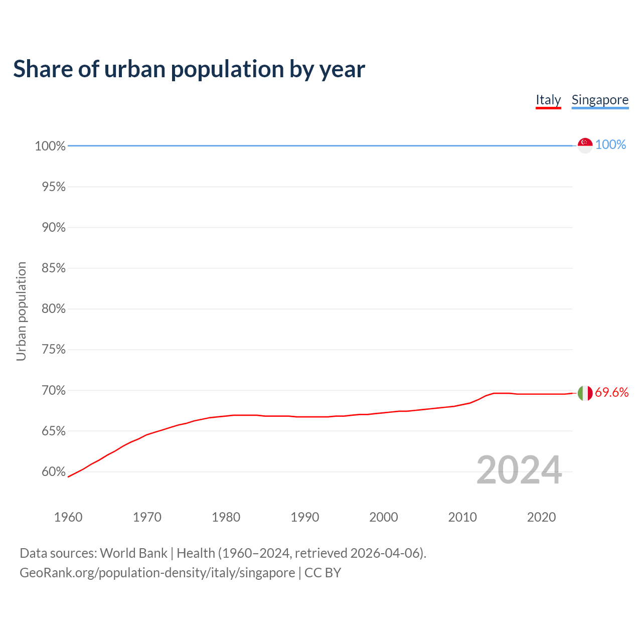 From 2004 to 2024, the share of urban population changed from 67.5% to 69.6% in Italy and from 100% to 100% in Singapore.