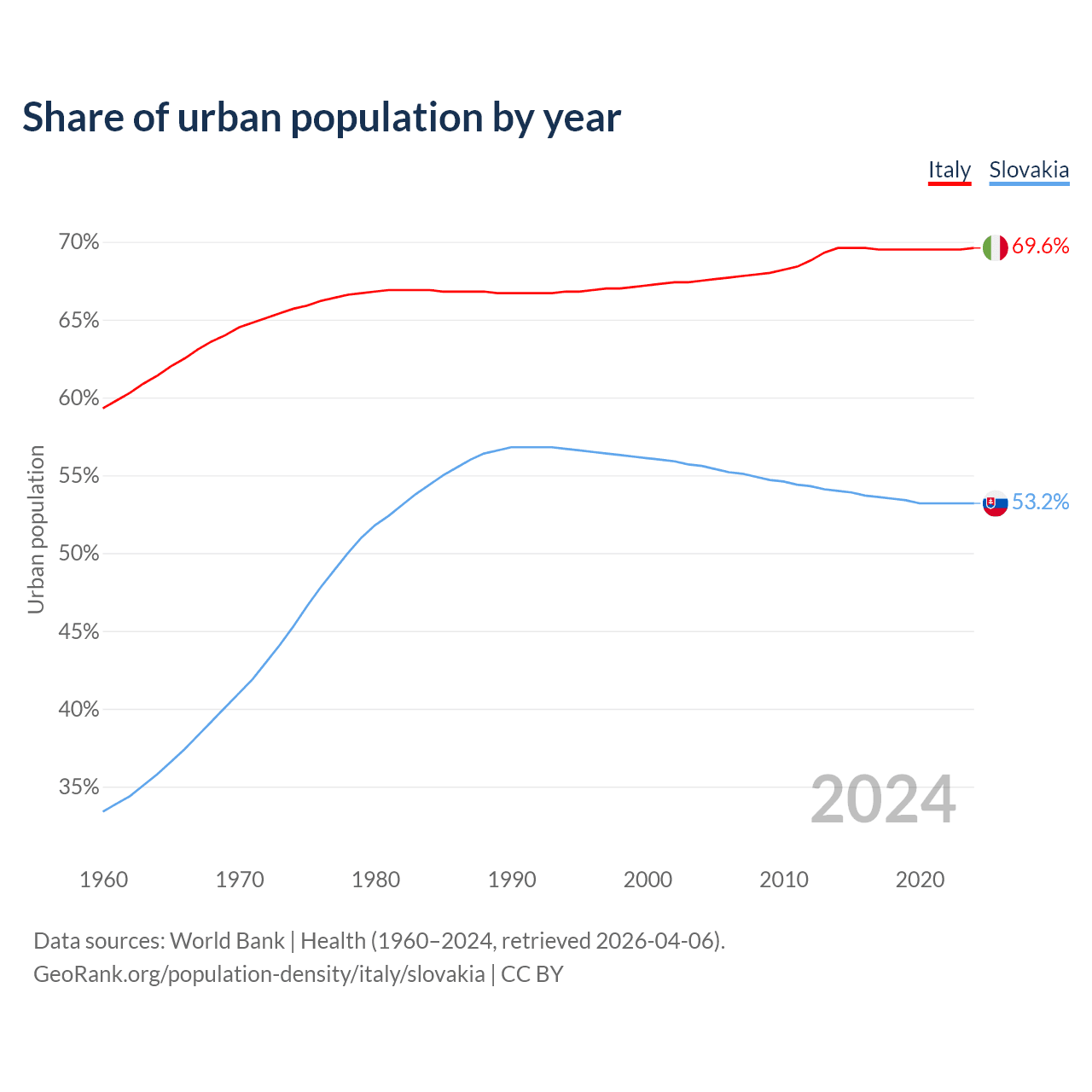 From 2004 to 2024, the share of urban population changed from 67.5% to 69.6% in Italy and from 55.6% to 53.2% in Slovakia.