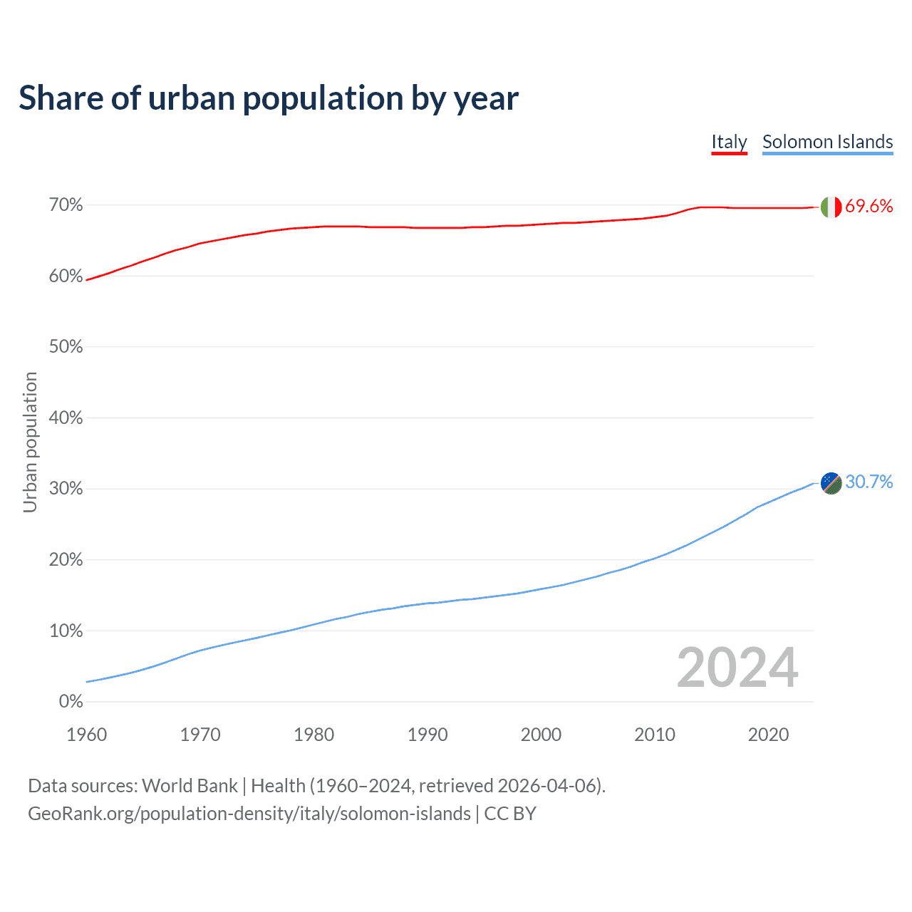 From 2004 to 2024, the share of urban population changed from 67.5% to 69.6% in Italy and from 17.2% to 30.7% in the Solomon Islands.