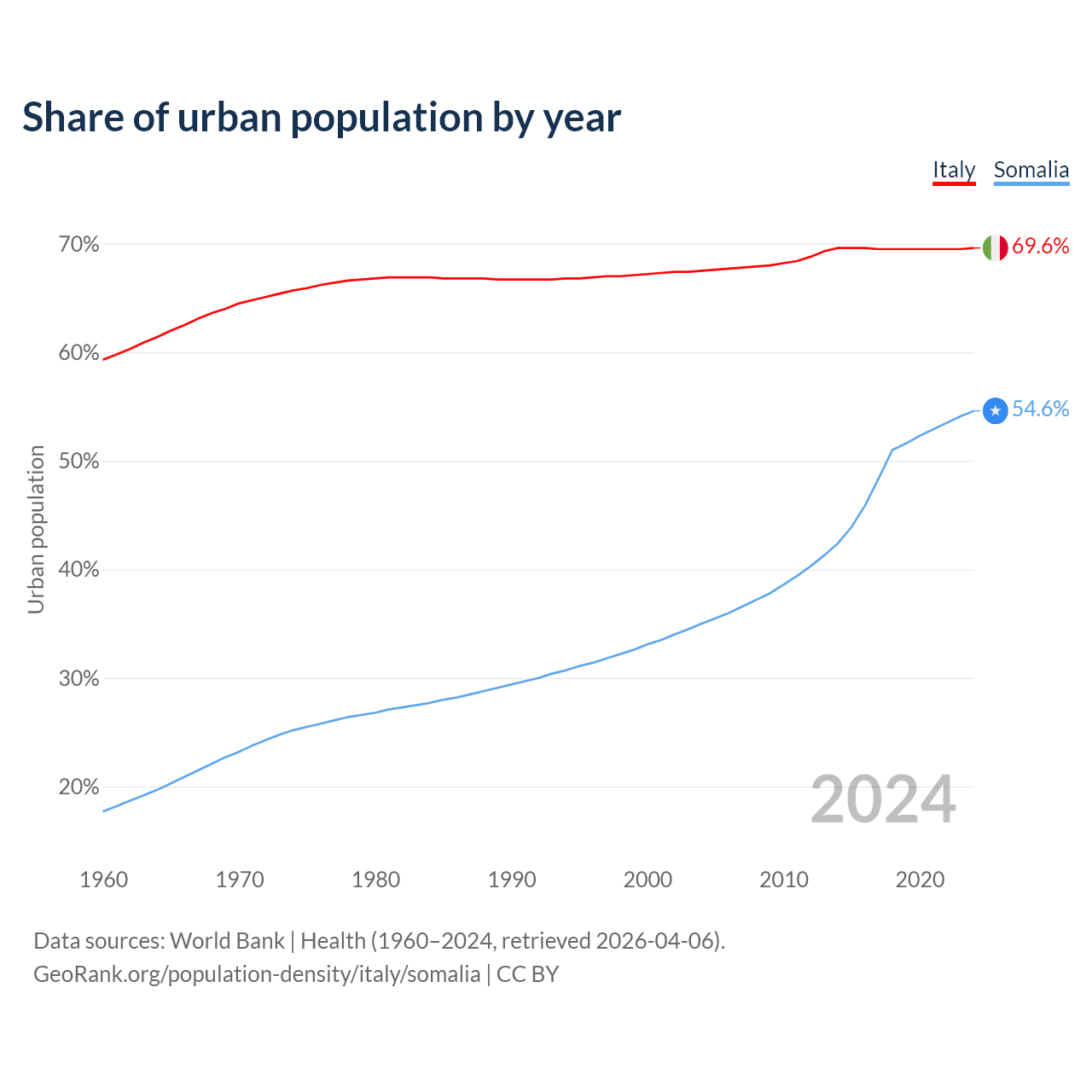 From 2004 to 2024, the share of urban population changed from 67.5% to 69.6% in Italy and from 35% to 54.6% in Somalia.
