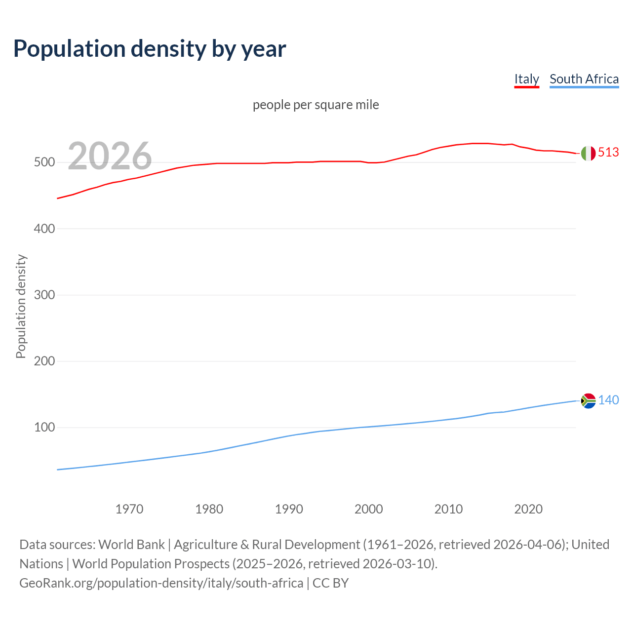 From 2006 to 2026, population density in Italy increased by 0.28%, compared to a 31% growth in South Africa.