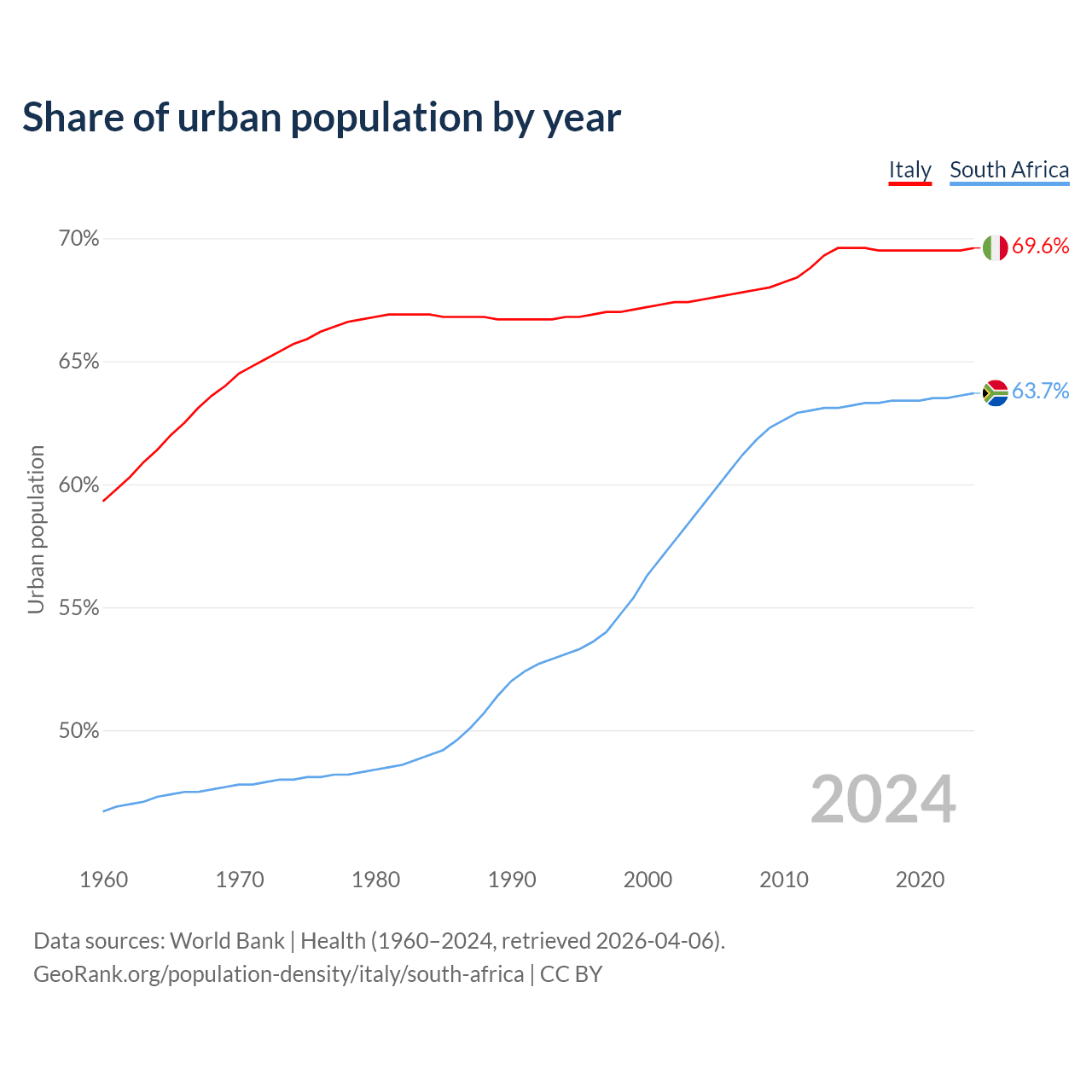 From 2004 to 2024, the share of urban population changed from 67.5% to 69.6% in Italy and from 59.1% to 63.7% in South Africa.