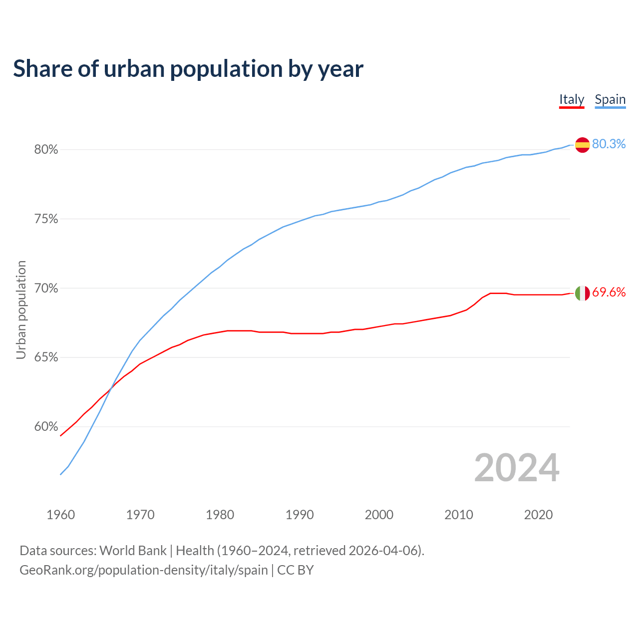 From 2004 to 2024, the share of urban population changed from 67.5% to 69.6% in Italy and from 77% to 80.3% in Spain.