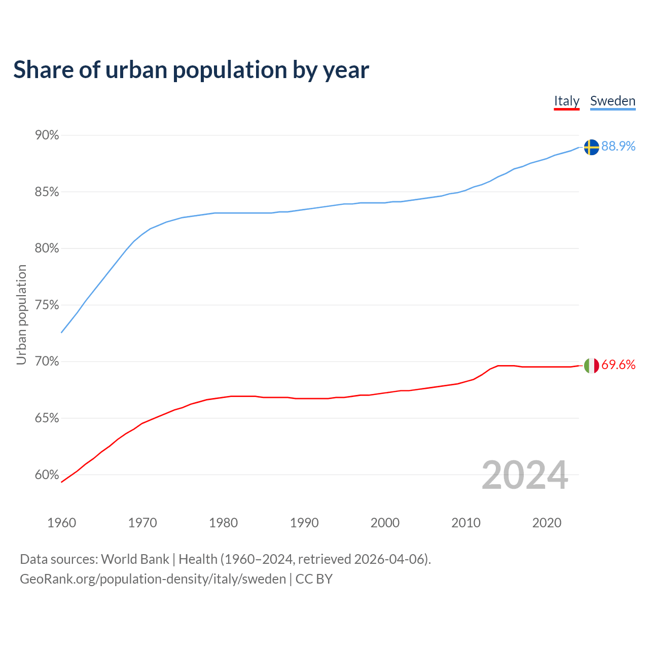 From 2004 to 2024, the share of urban population changed from 67.5% to 69.6% in Italy and from 84.3% to 88.9% in Sweden.