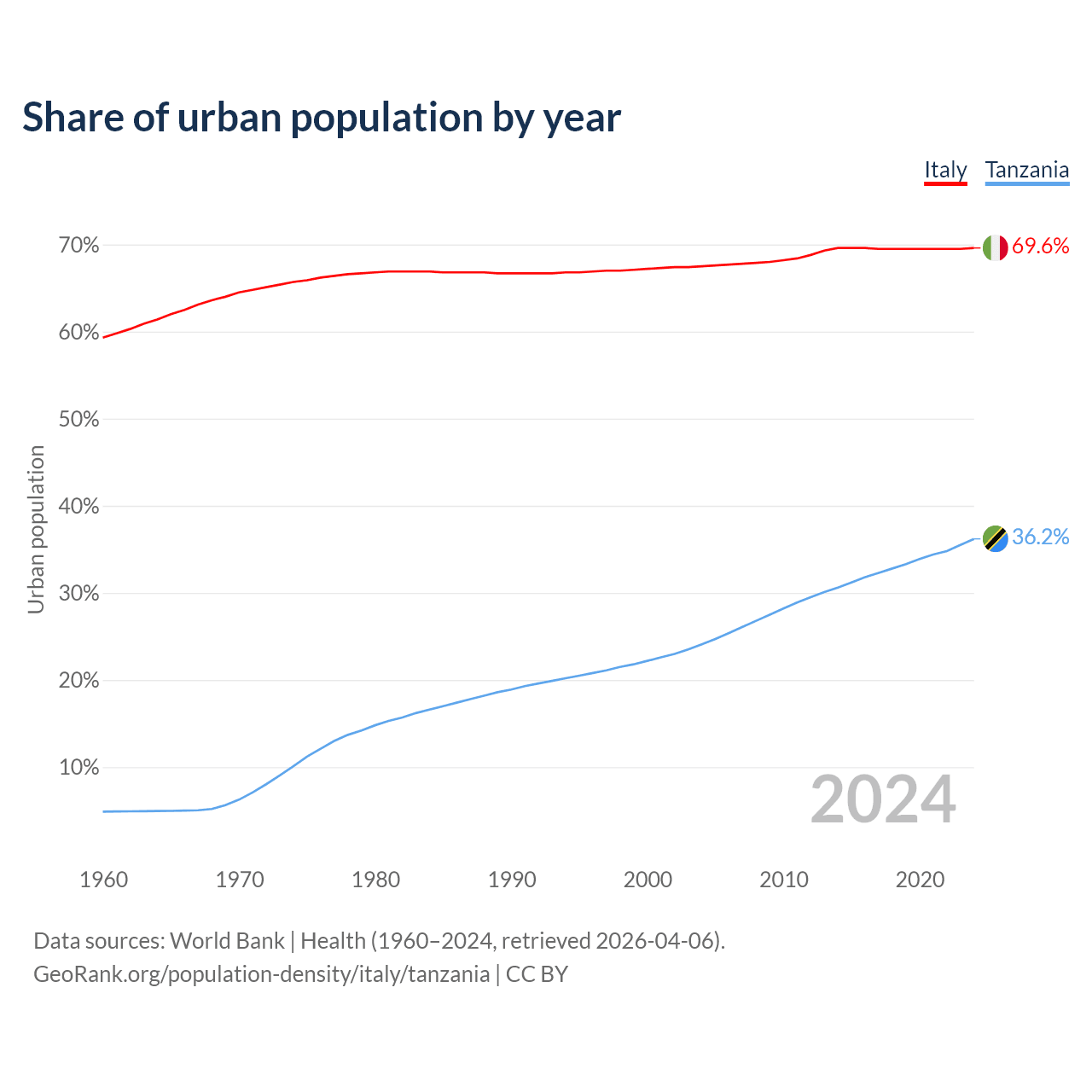 From 2004 to 2024, the share of urban population changed from 67.5% to 69.6% in Italy and from 24.1% to 36.2% in Tanzania.