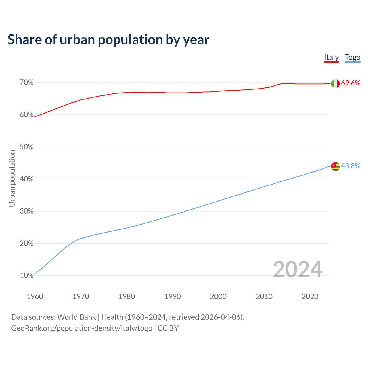 From 2004 to 2024, the share of urban population changed from 67.5% to 69.6% in Italy and from 34.9% to 43.8% in Togo.