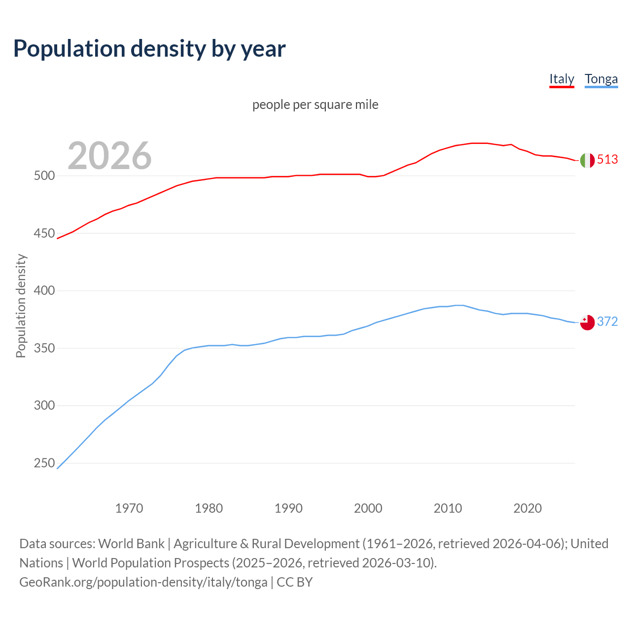 From 2006 to 2026, population density in Italy increased by 0.28%, compared to a 2.77% decline in Tonga.