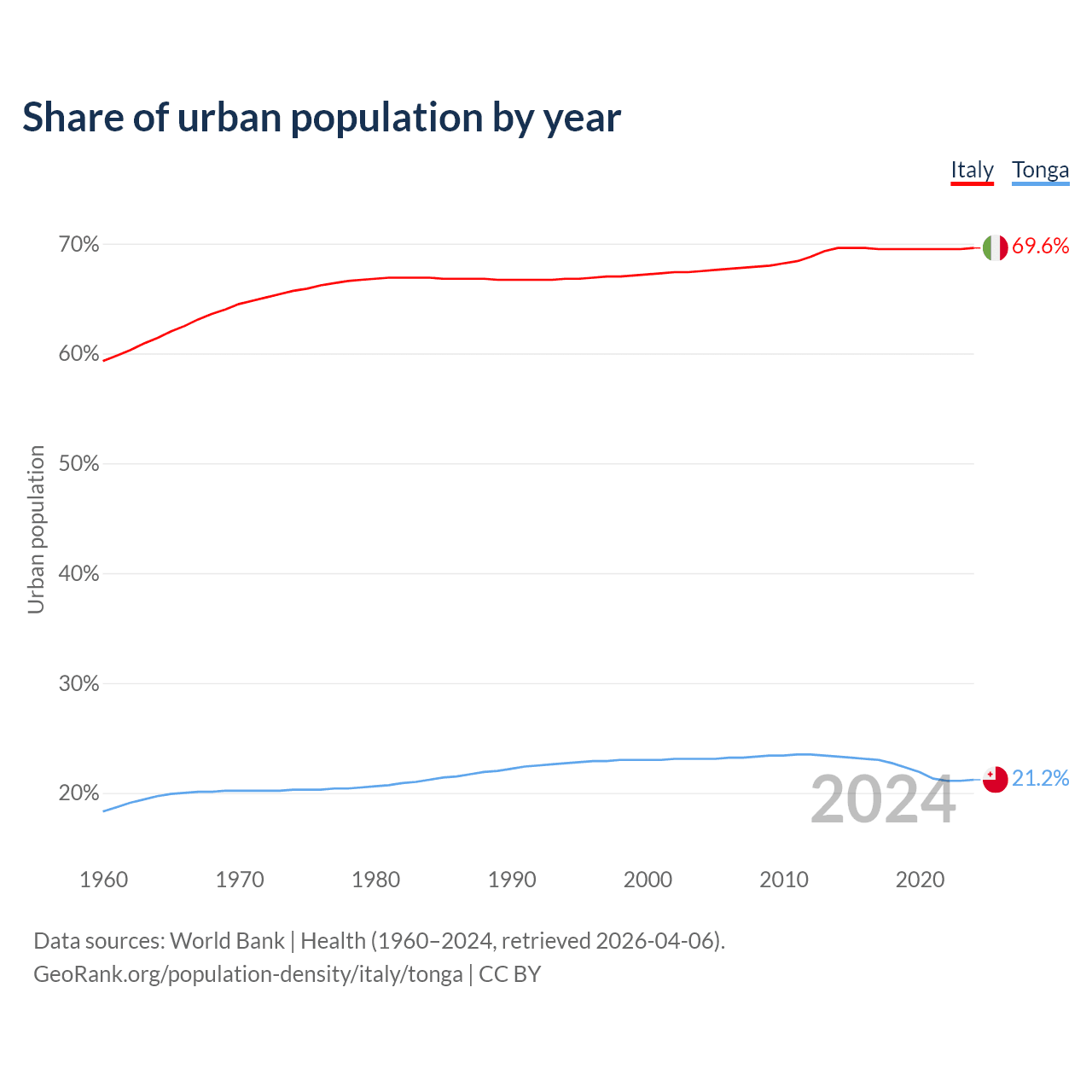 From 2004 to 2024, the share of urban population changed from 67.5% to 69.6% in Italy and from 23.1% to 21.2% in Tonga.
