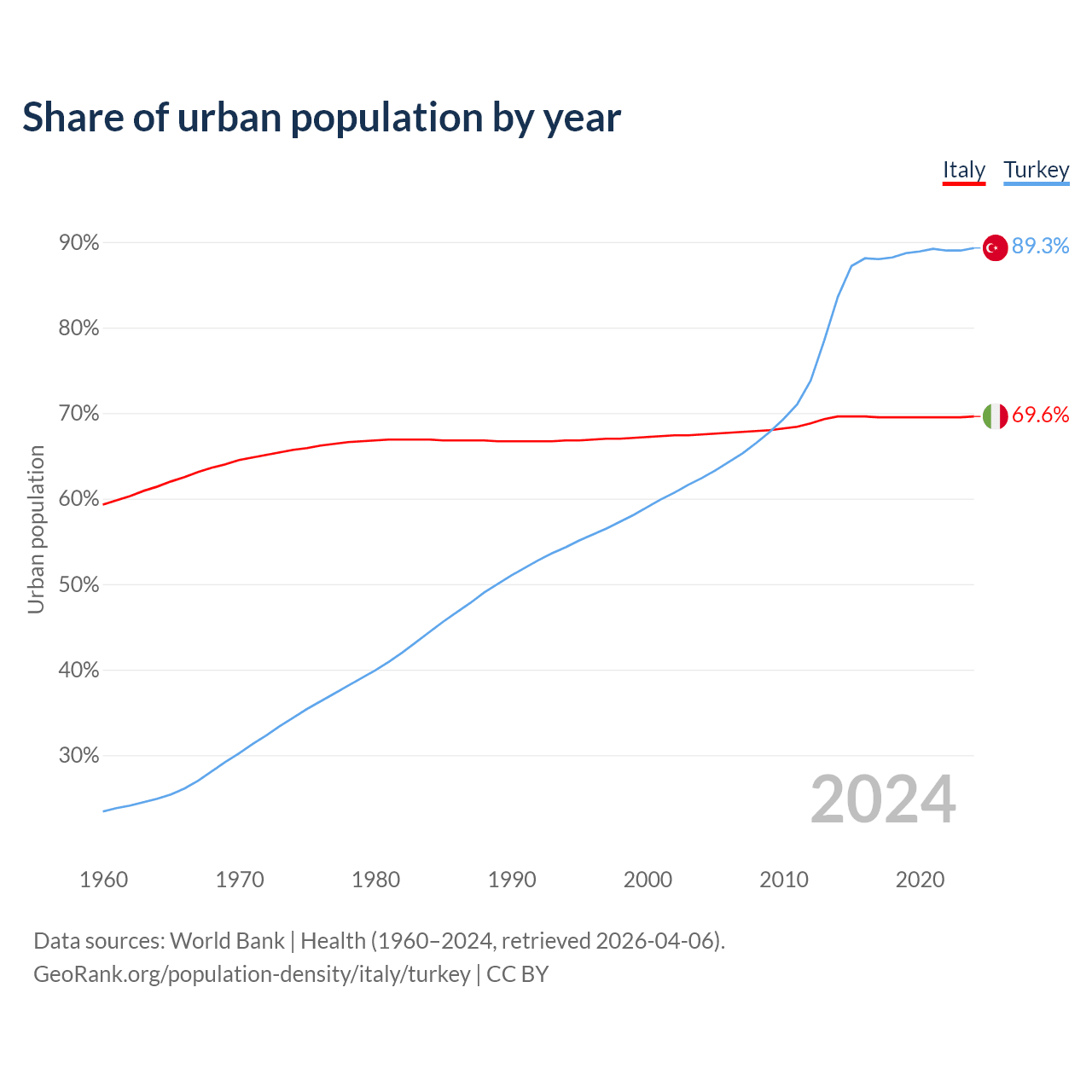 From 2004 to 2024, the share of urban population changed from 67.5% to 69.6% in Italy and from 62.4% to 89.3% in Turkey.