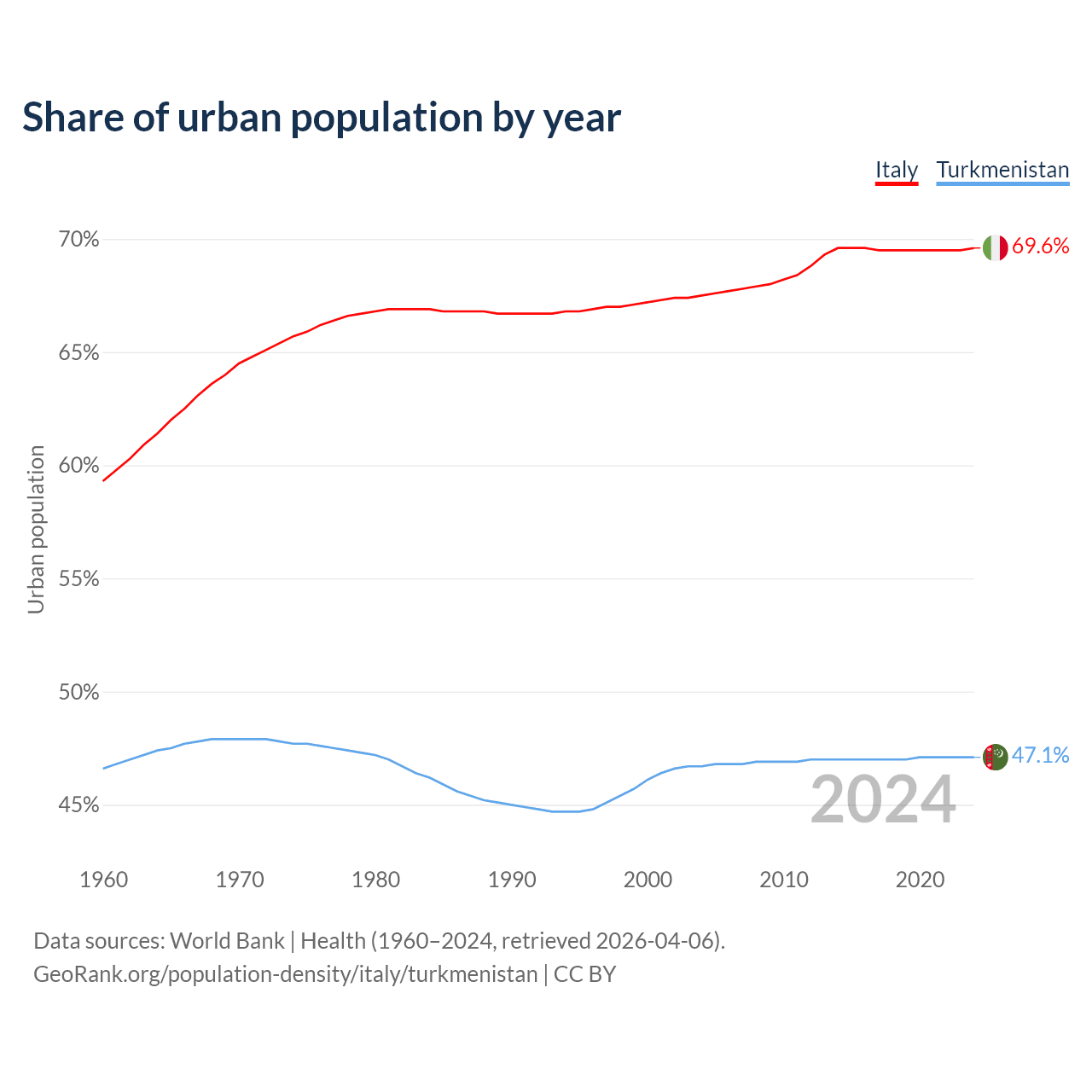 From 2004 to 2024, the share of urban population changed from 67.5% to 69.6% in Italy and from 46.7% to 47.1% in Turkmenistan.