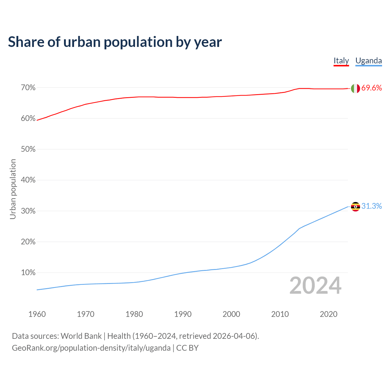 From 2004 to 2024, the share of urban population changed from 67.5% to 69.6% in Italy and from 13.1% to 31.3% in Uganda.