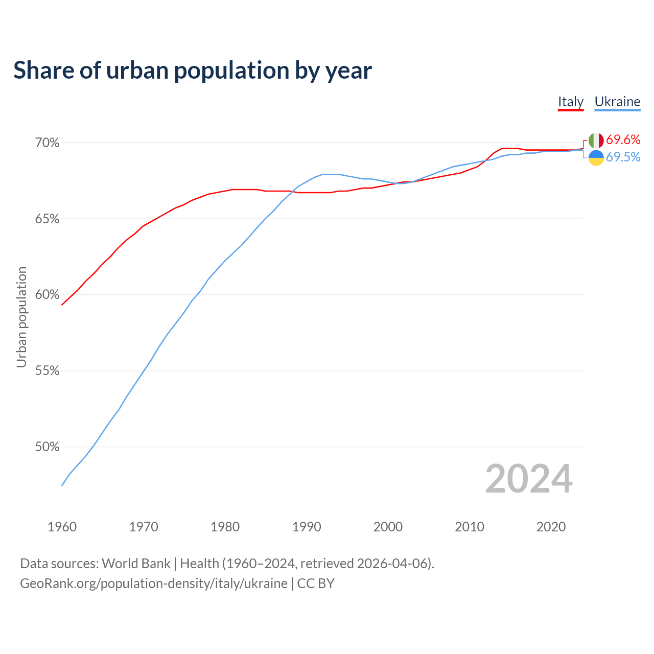From 2004 to 2024, the share of urban population changed from 67.5% to 69.6% in Italy and from 67.6% to 69.5% in Ukraine.