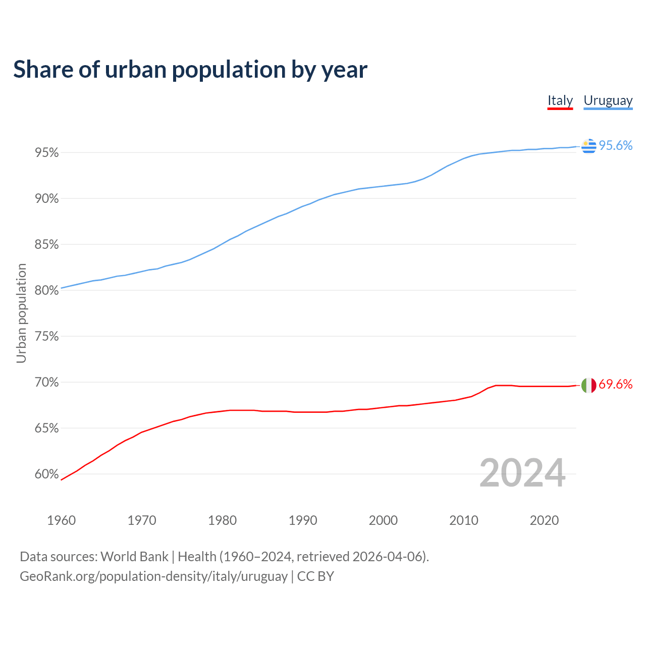 From 2004 to 2024, the share of urban population changed from 67.5% to 69.6% in Italy and from 91.8% to 95.6% in Uruguay.