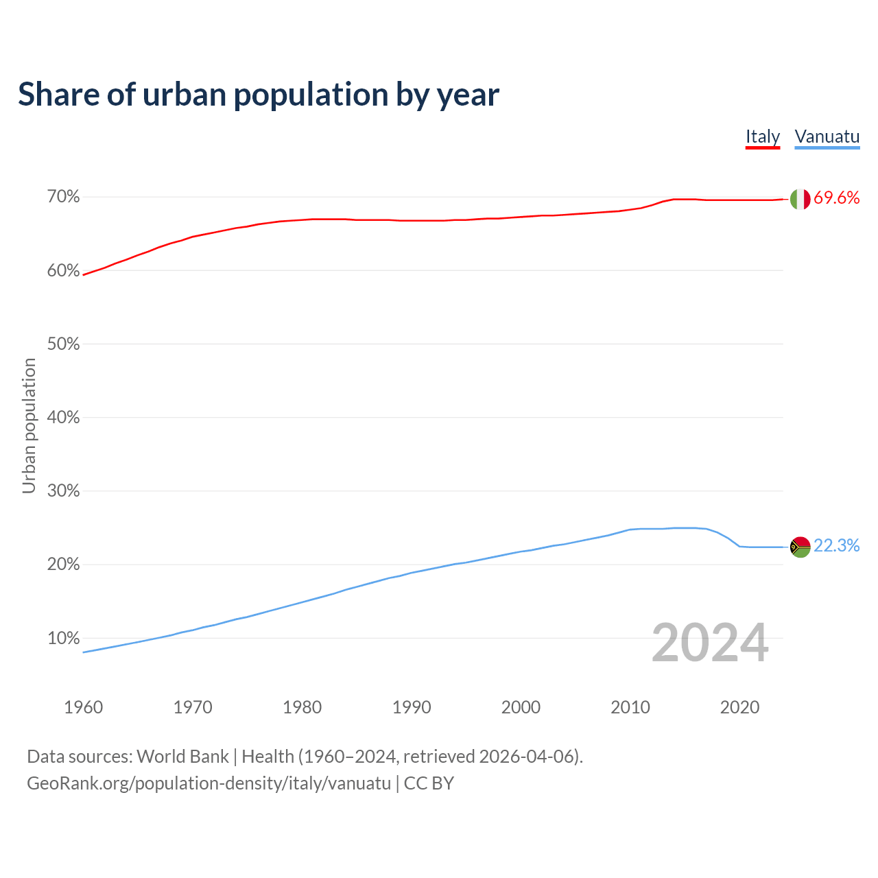From 2004 to 2024, the share of urban population changed from 67.5% to 69.6% in Italy and from 22.7% to 22.3% in Vanuatu.