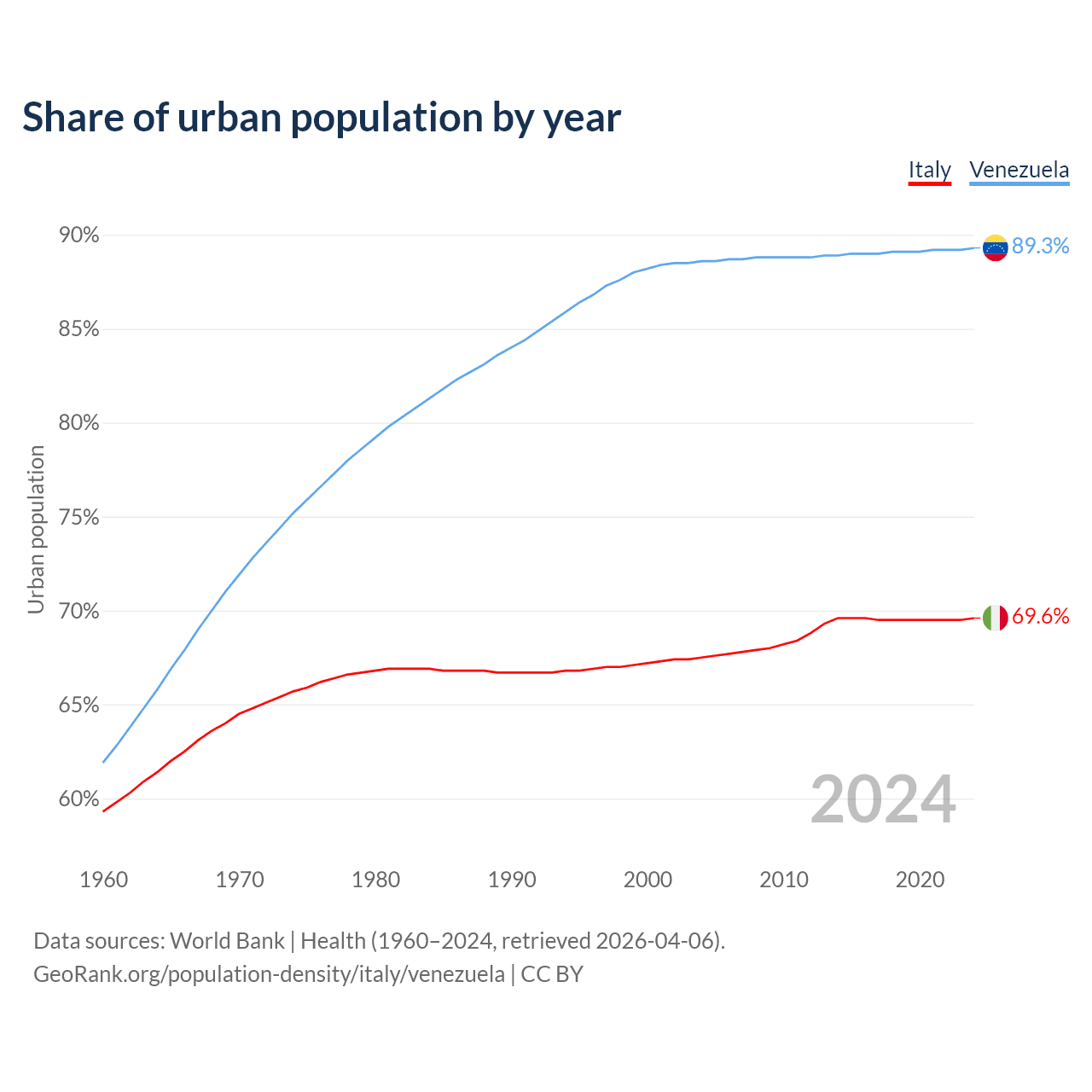From 2004 to 2024, the share of urban population changed from 67.5% to 69.6% in Italy and from 88.6% to 89.3% in Venezuela.