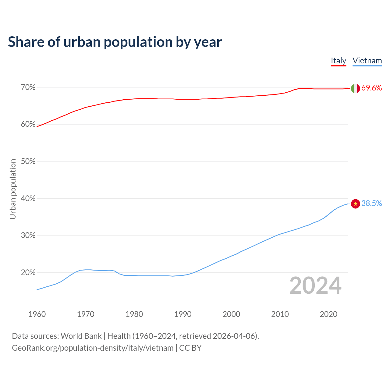 From 2004 to 2024, the share of urban population changed from 67.5% to 69.6% in Italy and from 26.8% to 38.5% in Vietnam.