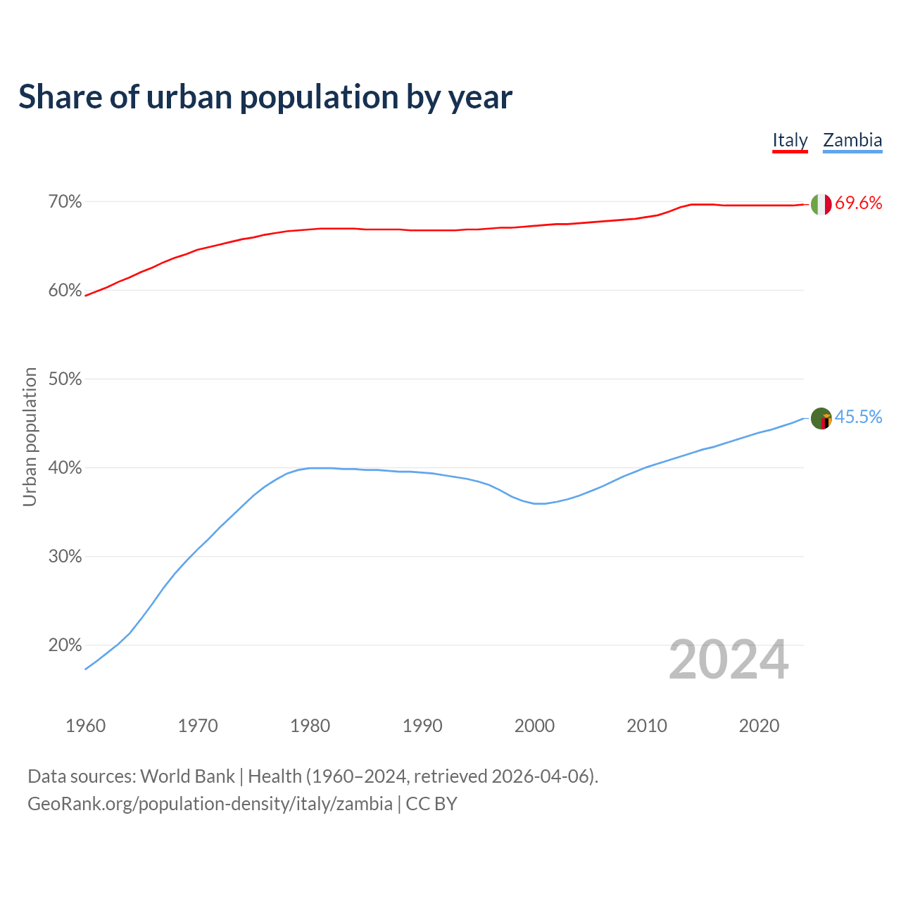 From 2004 to 2024, the share of urban population changed from 67.5% to 69.6% in Italy and from 36.8% to 45.5% in Zambia.