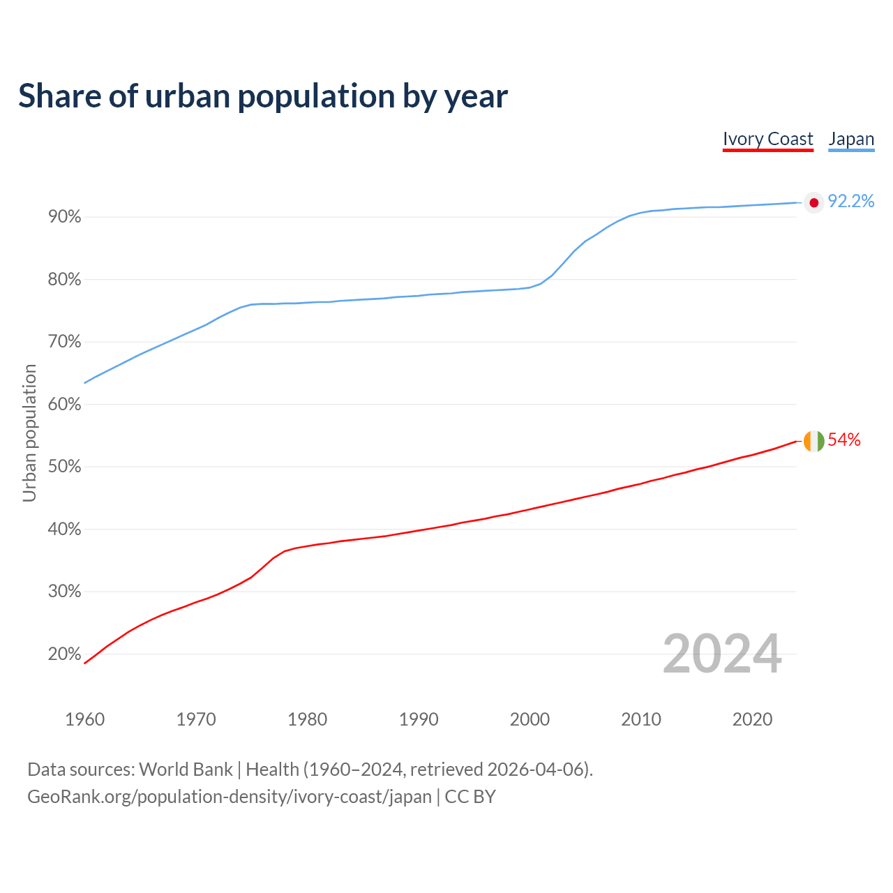 From 2004 to 2024, the share of urban population changed from 44.7% to 54% in Ivory Coast and from 84.4% to 92.2% in Japan.