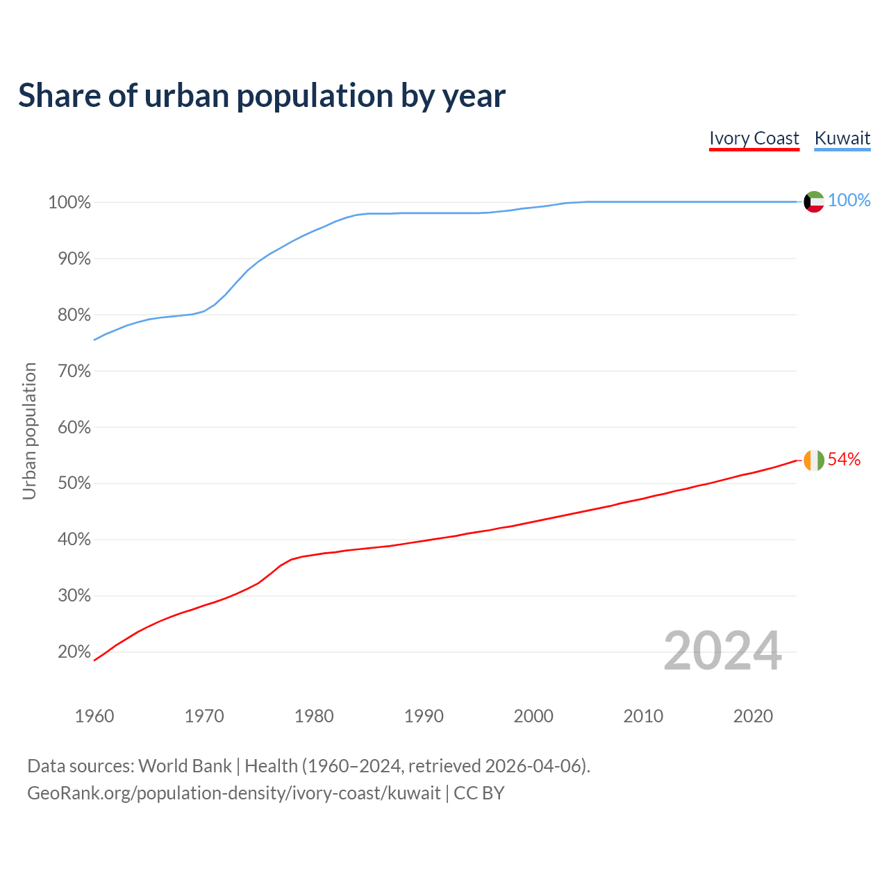 From 2004 to 2024, the share of urban population changed from 44.7% to 54% in Ivory Coast and from 99.9% to 100% in Kuwait.