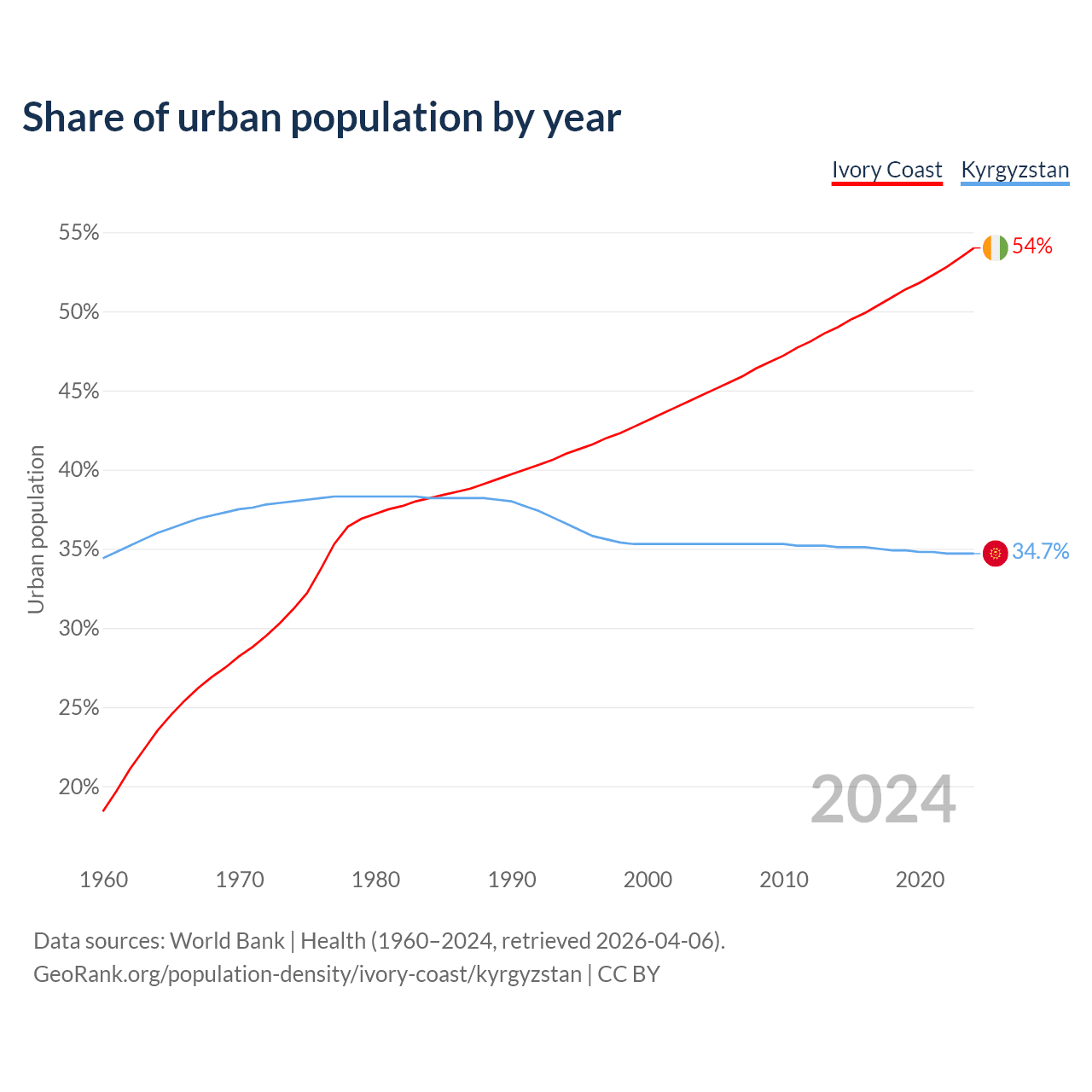 From 2004 to 2024, the share of urban population changed from 44.7% to 54% in Ivory Coast and from 35.3% to 34.7% in Kyrgyzstan.