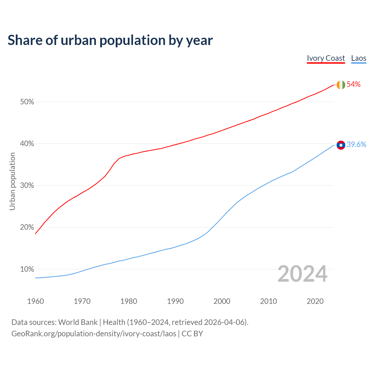 From 2004 to 2024, the share of urban population changed from 44.7% to 54% in Ivory Coast and from 26.5% to 39.6% in Laos.