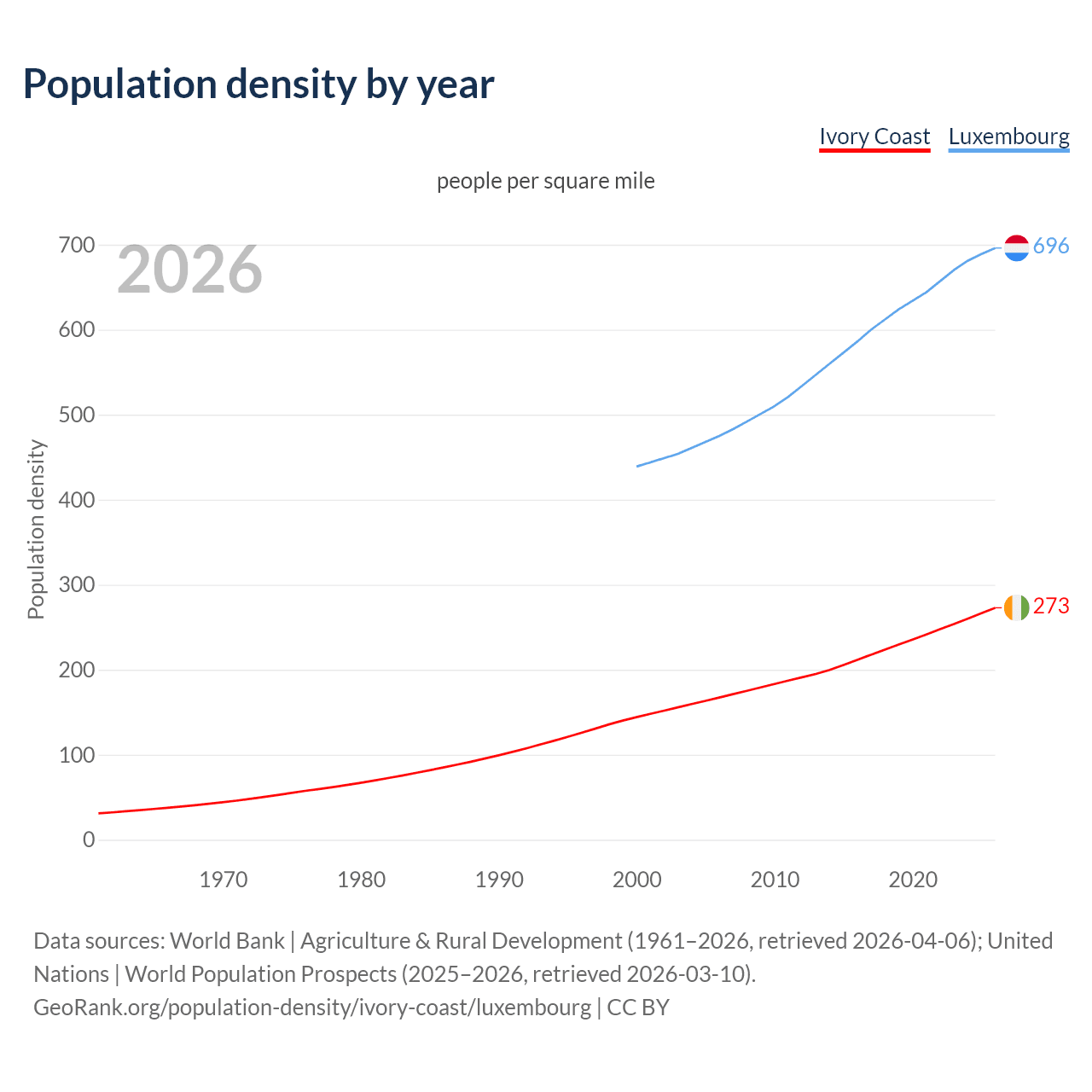 From 2006 to 2026, population density in Ivory Coast increased by 63.1%, compared to a 46.4% growth in Luxembourg.