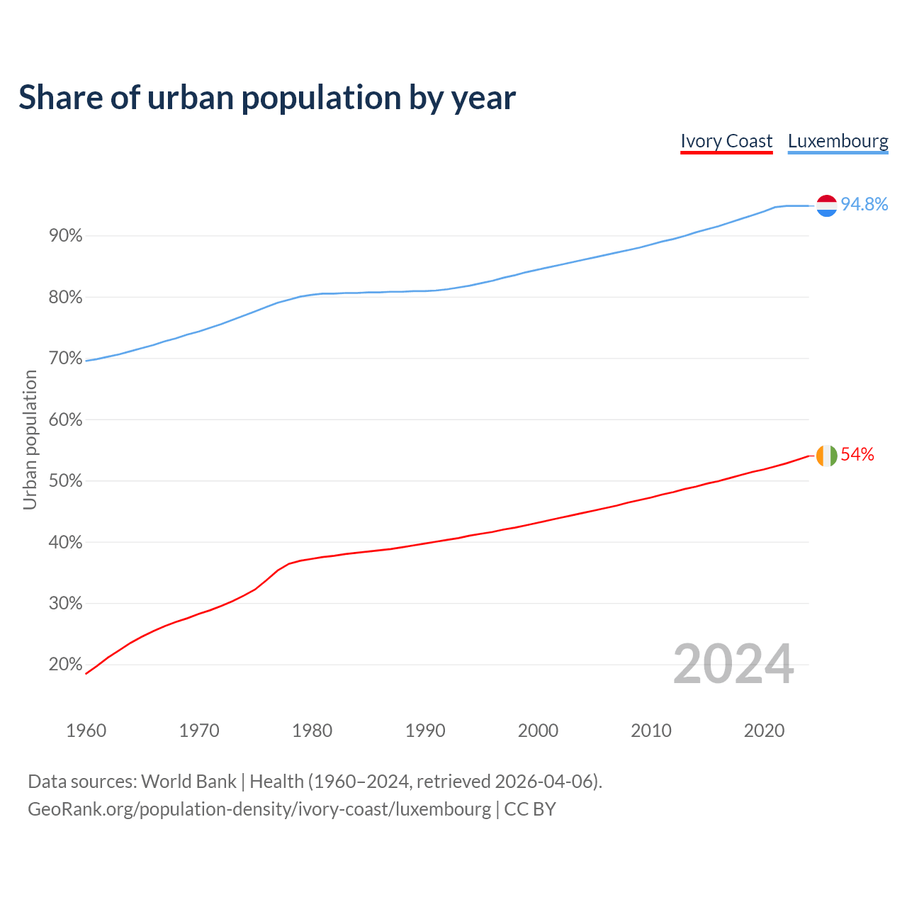 From 2004 to 2024, the share of urban population changed from 44.7% to 54% in Ivory Coast and from 86% to 94.8% in Luxembourg.