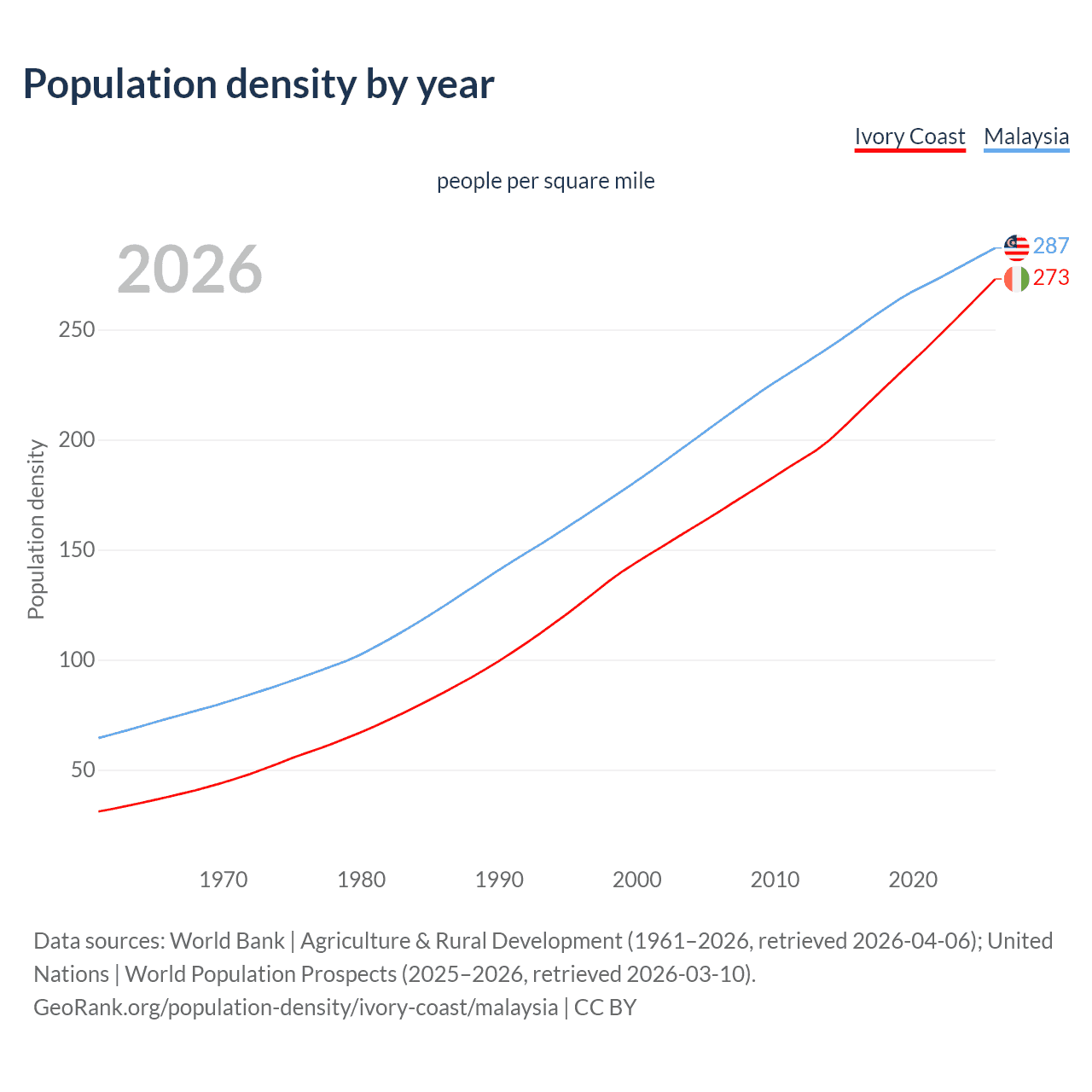 From 2006 to 2026, population density in Ivory Coast increased by 63.1%, compared to a 37.8% growth in Malaysia.