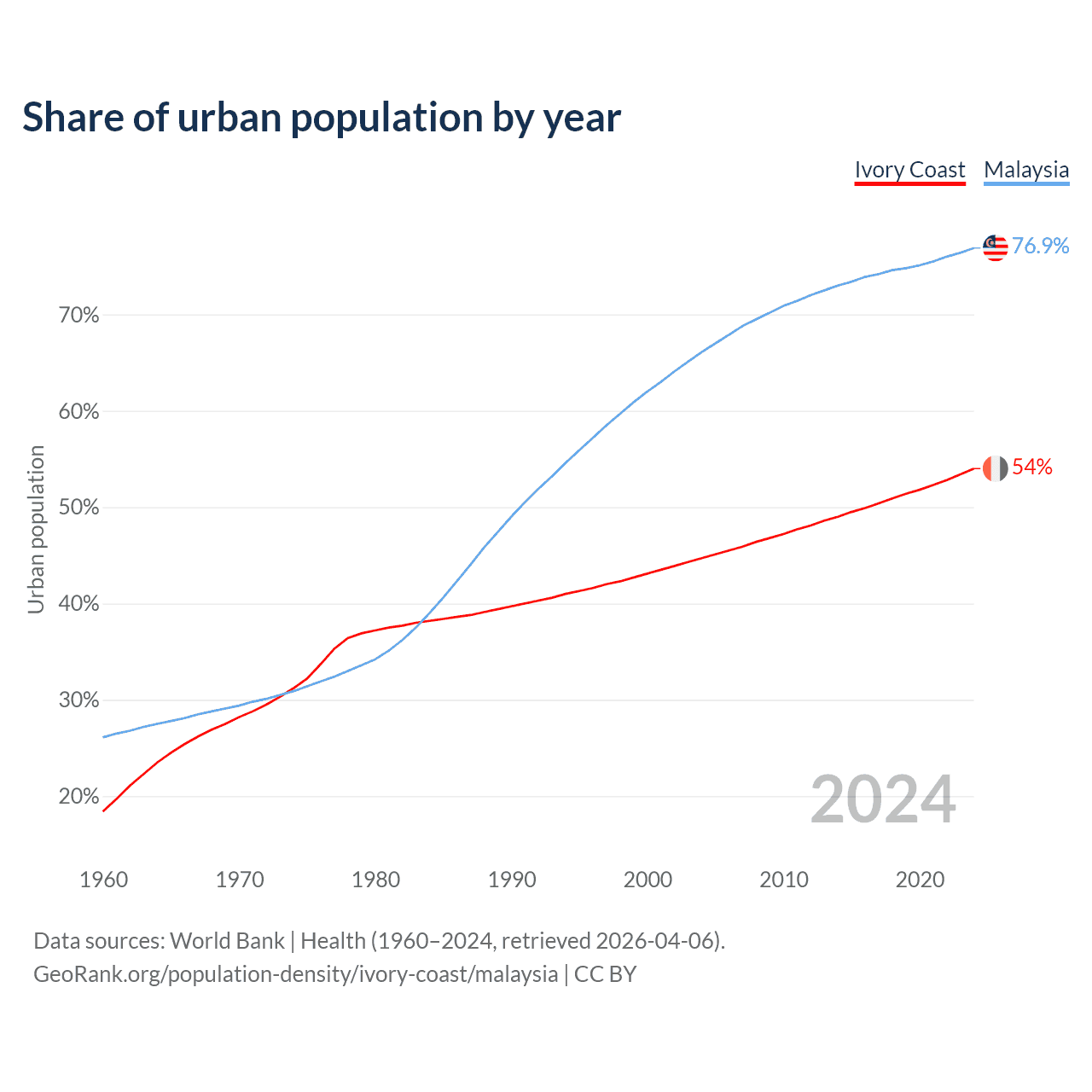 From 2004 to 2024, the share of urban population changed from 44.7% to 54% in Ivory Coast and from 66.1% to 76.9% in Malaysia.
