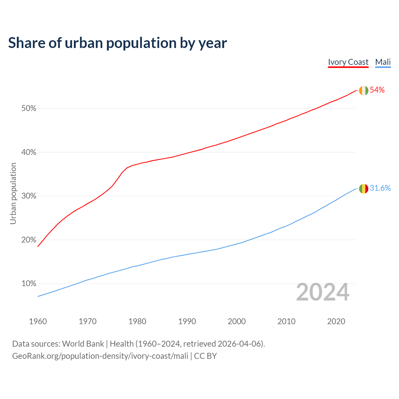 From 2004 to 2024, the share of urban population changed from 44.7% to 54% in Ivory Coast and from 20.5% to 31.6% in Mali.