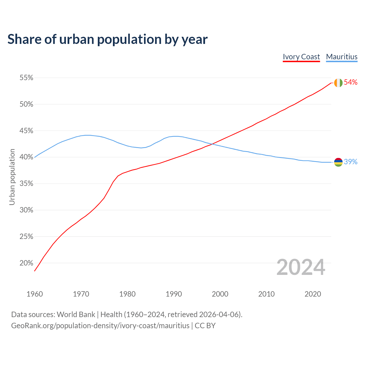 From 2004 to 2024, the share of urban population changed from 44.7% to 54% in Ivory Coast and from 41.3% to 39% in Mauritius.