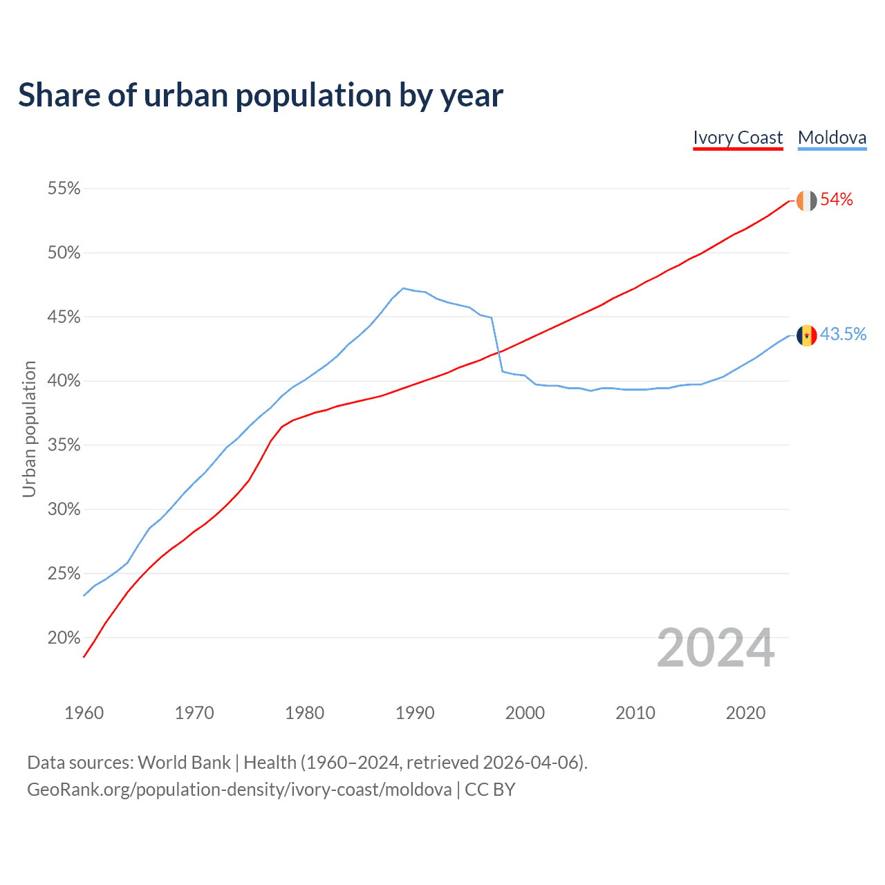 From 2004 to 2024, the share of urban population changed from 44.7% to 54% in Ivory Coast and from 39.4% to 43.5% in Moldova.