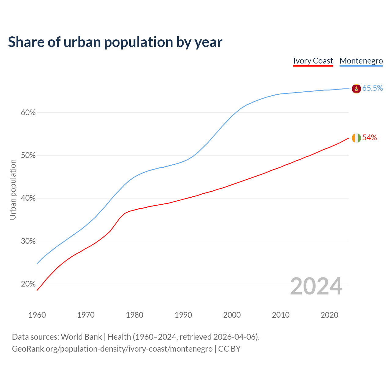 From 2004 to 2024, the share of urban population changed from 44.7% to 54% in Ivory Coast and from 62.2% to 65.5% in Montenegro.