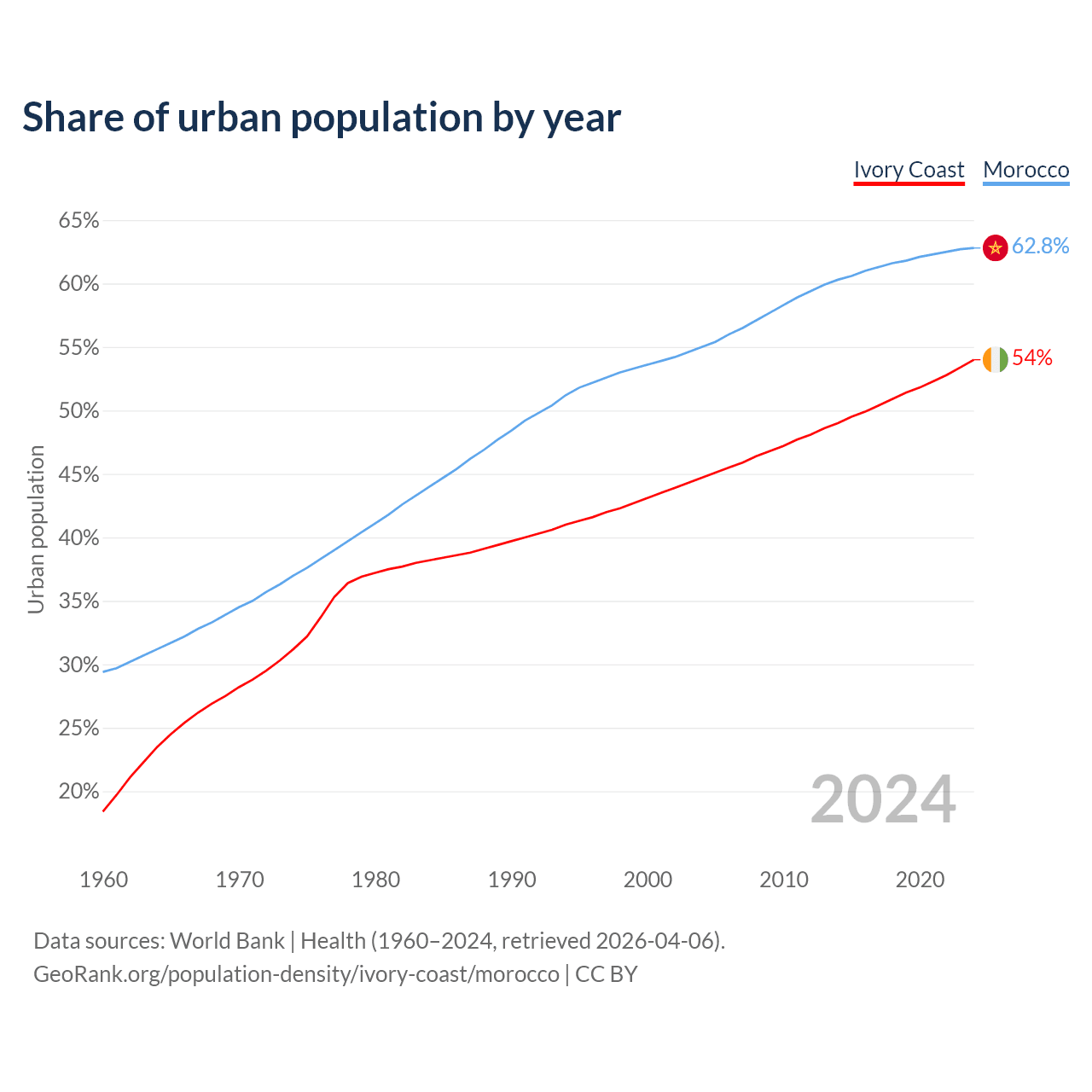 From 2004 to 2024, the share of urban population changed from 44.7% to 54% in Ivory Coast and from 55% to 62.8% in Morocco.