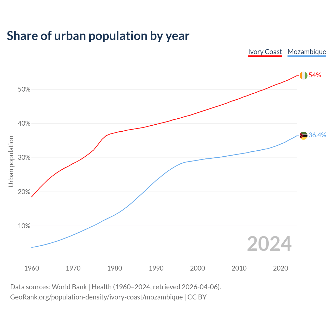 From 2004 to 2024, the share of urban population changed from 44.7% to 54% in Ivory Coast and from 29.9% to 36.4% in Mozambique.