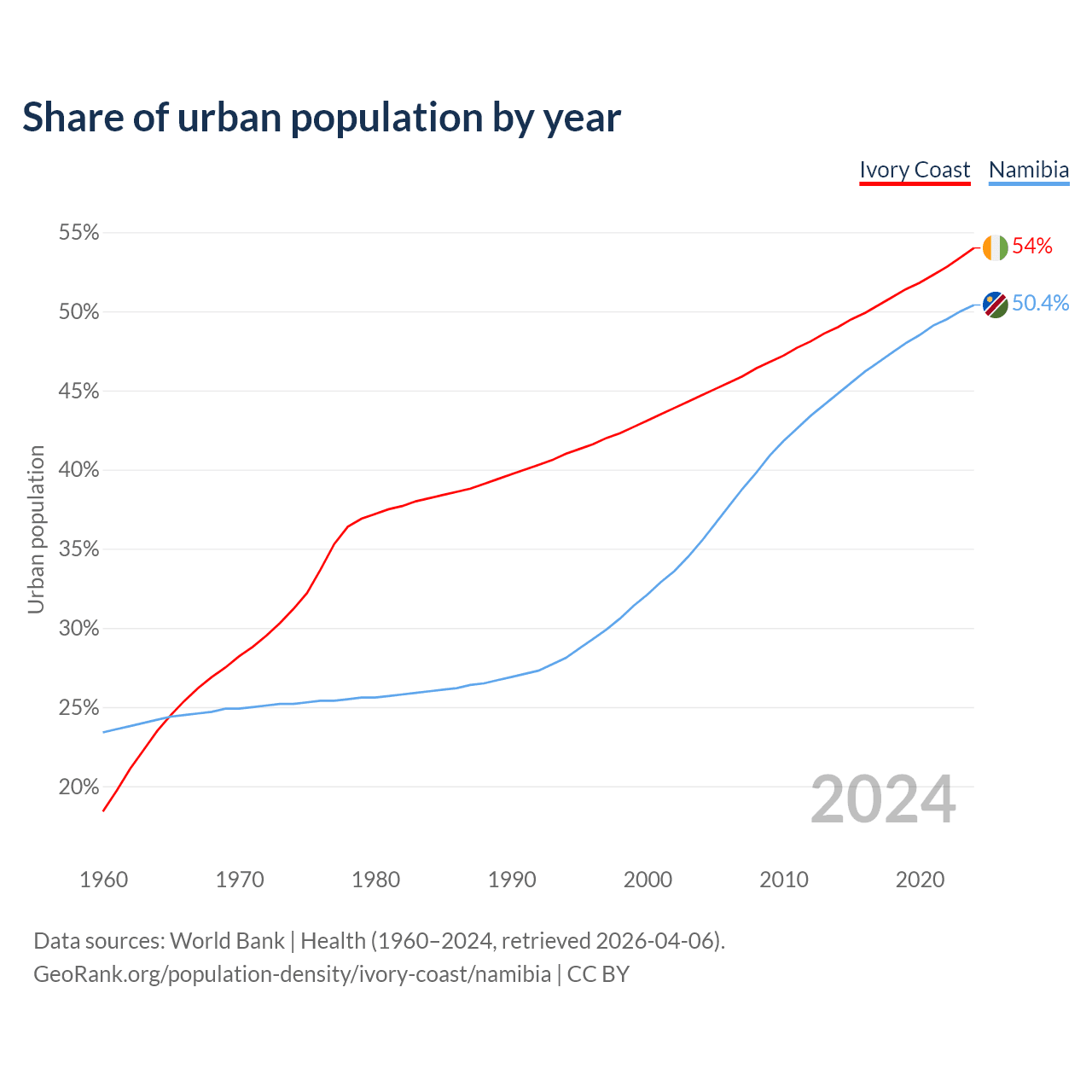 From 2004 to 2024, the share of urban population changed from 44.7% to 54% in Ivory Coast and from 35.5% to 50.4% in Namibia.