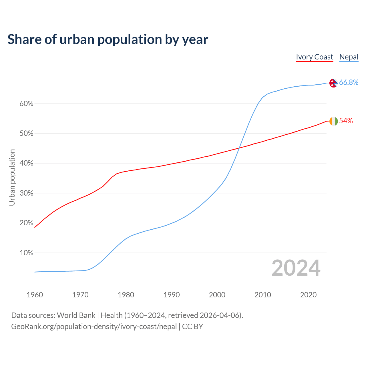 From 2004 to 2024, the share of urban population changed from 44.7% to 54% in Ivory Coast and from 41.6% to 66.8% in Nepal.