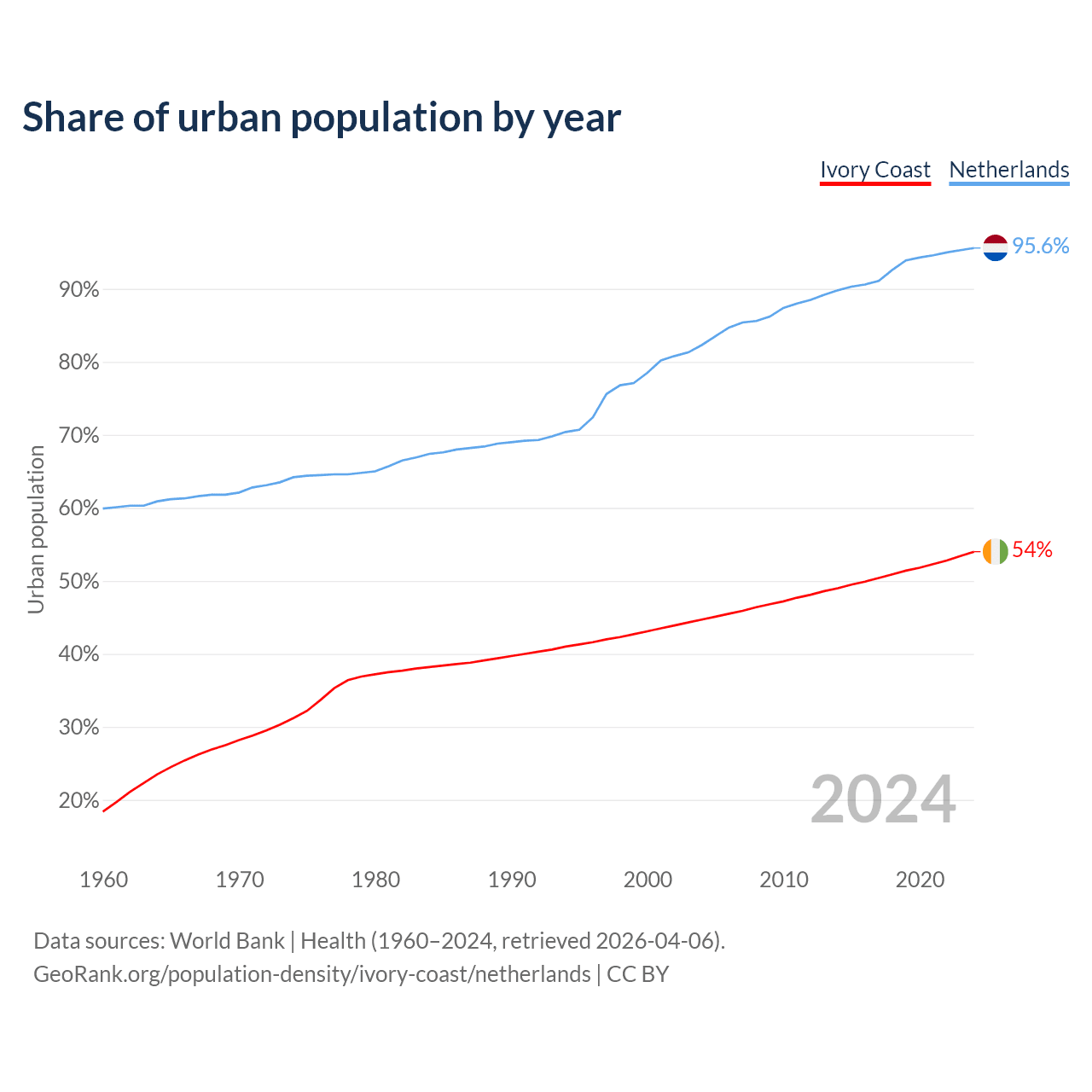 From 2004 to 2024, the share of urban population changed from 44.7% to 54% in Ivory Coast and from 82.3% to 95.6% in the Netherlands.