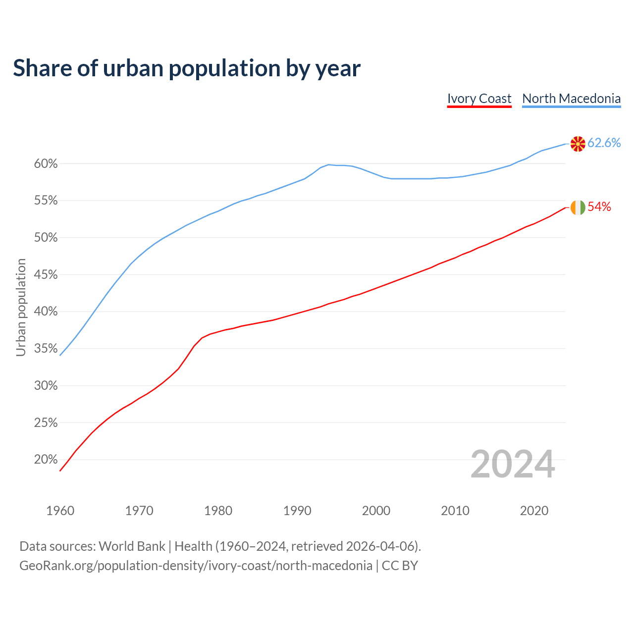 From 2004 to 2024, the share of urban population changed from 44.7% to 54% in Ivory Coast and from 57.9% to 62.6% in North Macedonia.