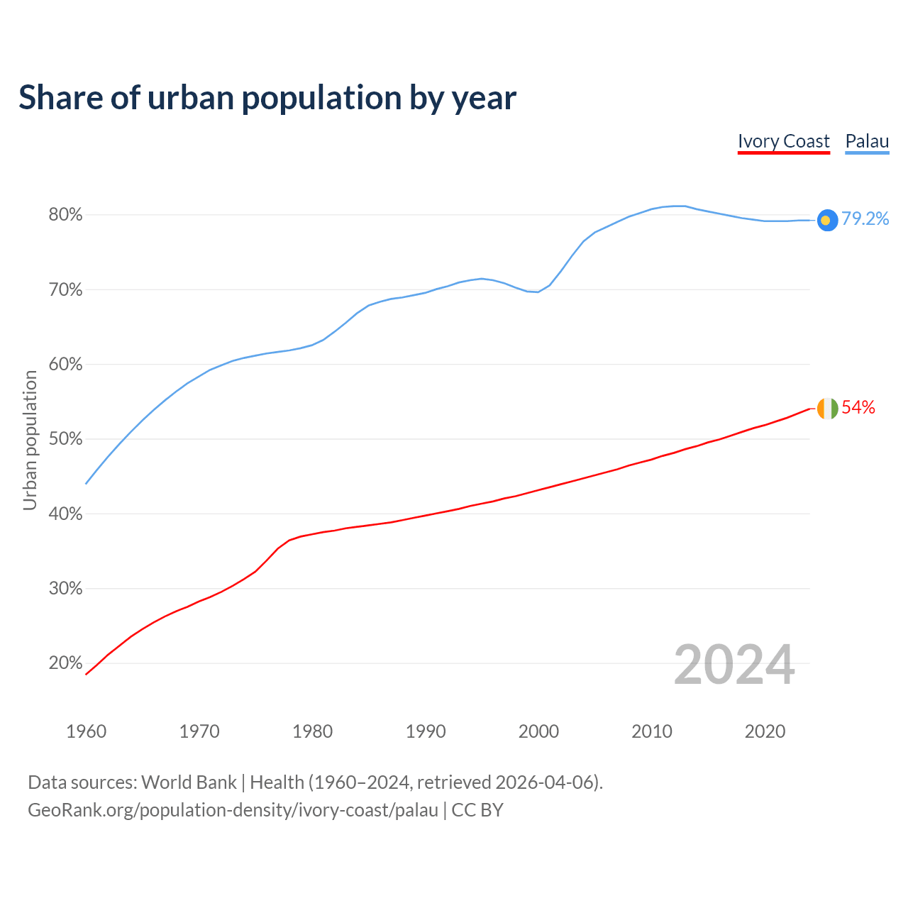 From 2004 to 2024, the share of urban population changed from 44.7% to 54% in Ivory Coast and from 76.4% to 79.2% in Palau.