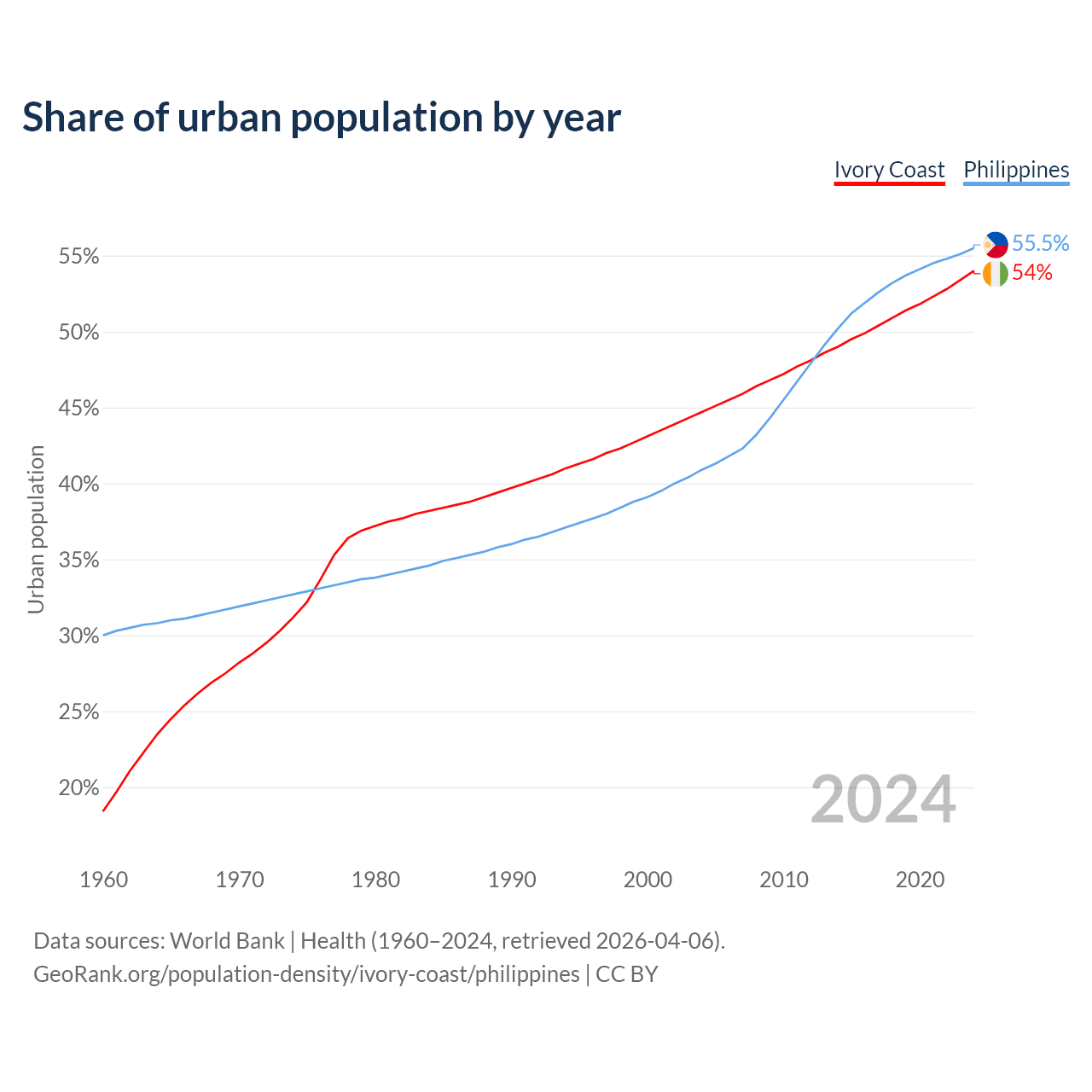 From 2004 to 2024, the share of urban population changed from 44.7% to 54% in Ivory Coast and from 40.9% to 55.5% in the Philippines.
