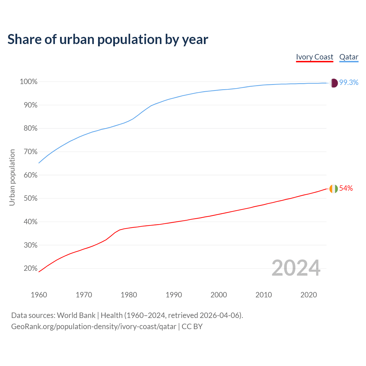 From 2004 to 2024, the share of urban population changed from 44.7% to 54% in Ivory Coast and from 97% to 99.3% in Qatar.