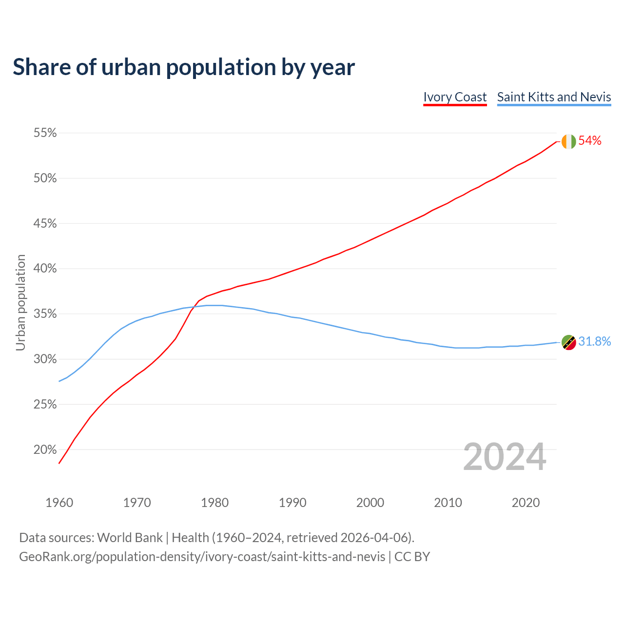From 2004 to 2024, the share of urban population changed from 44.7% to 54% in Ivory Coast and from 32.1% to 31.8% in Saint Kitts and Nevis.