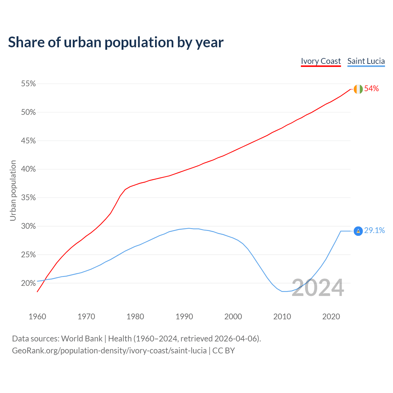 From 2004 to 2024, the share of urban population changed from 44.7% to 54% in Ivory Coast and from 24.8% to 29.1% in Saint Lucia.