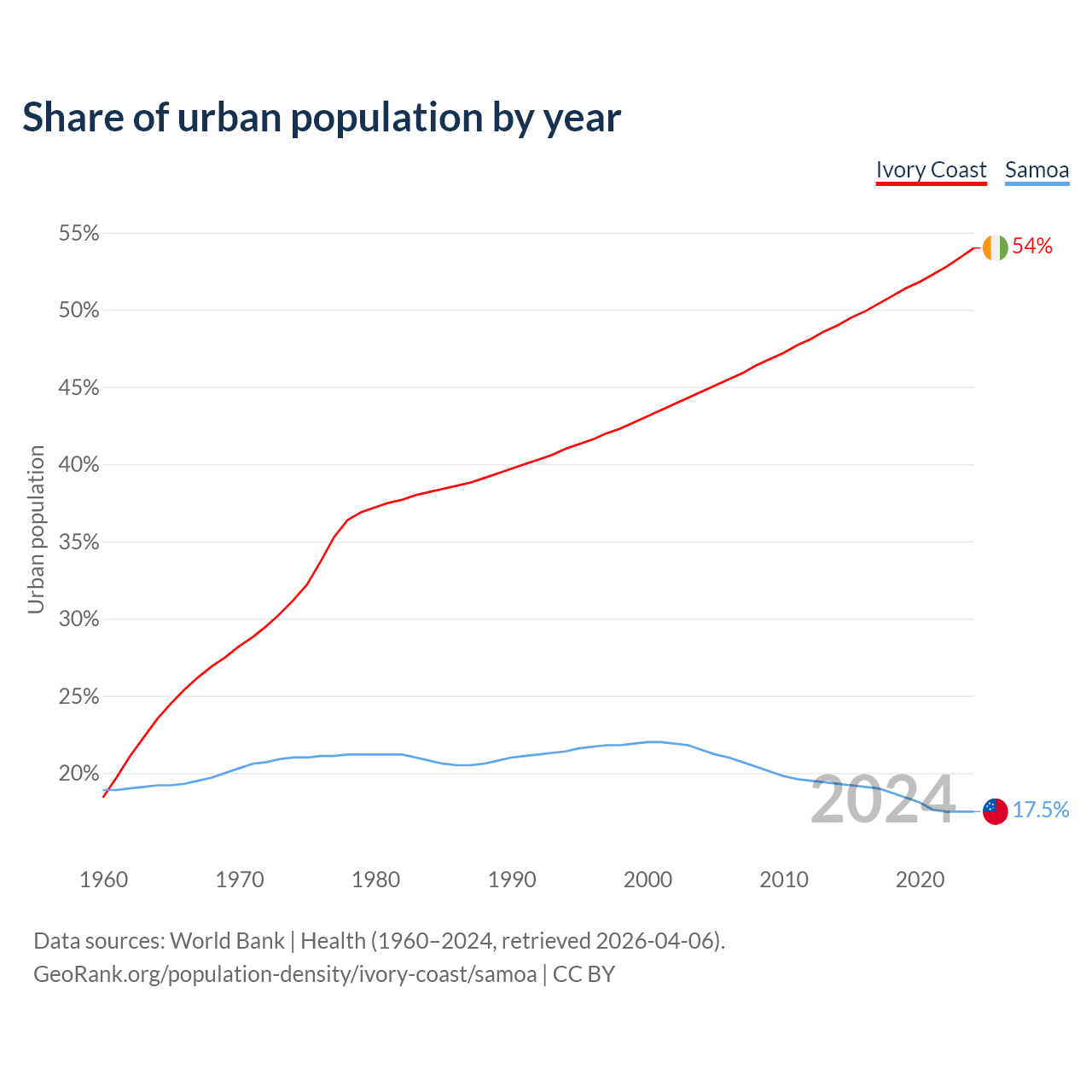 From 2004 to 2024, the share of urban population changed from 44.7% to 54% in Ivory Coast and from 21.5% to 17.5% in Samoa.