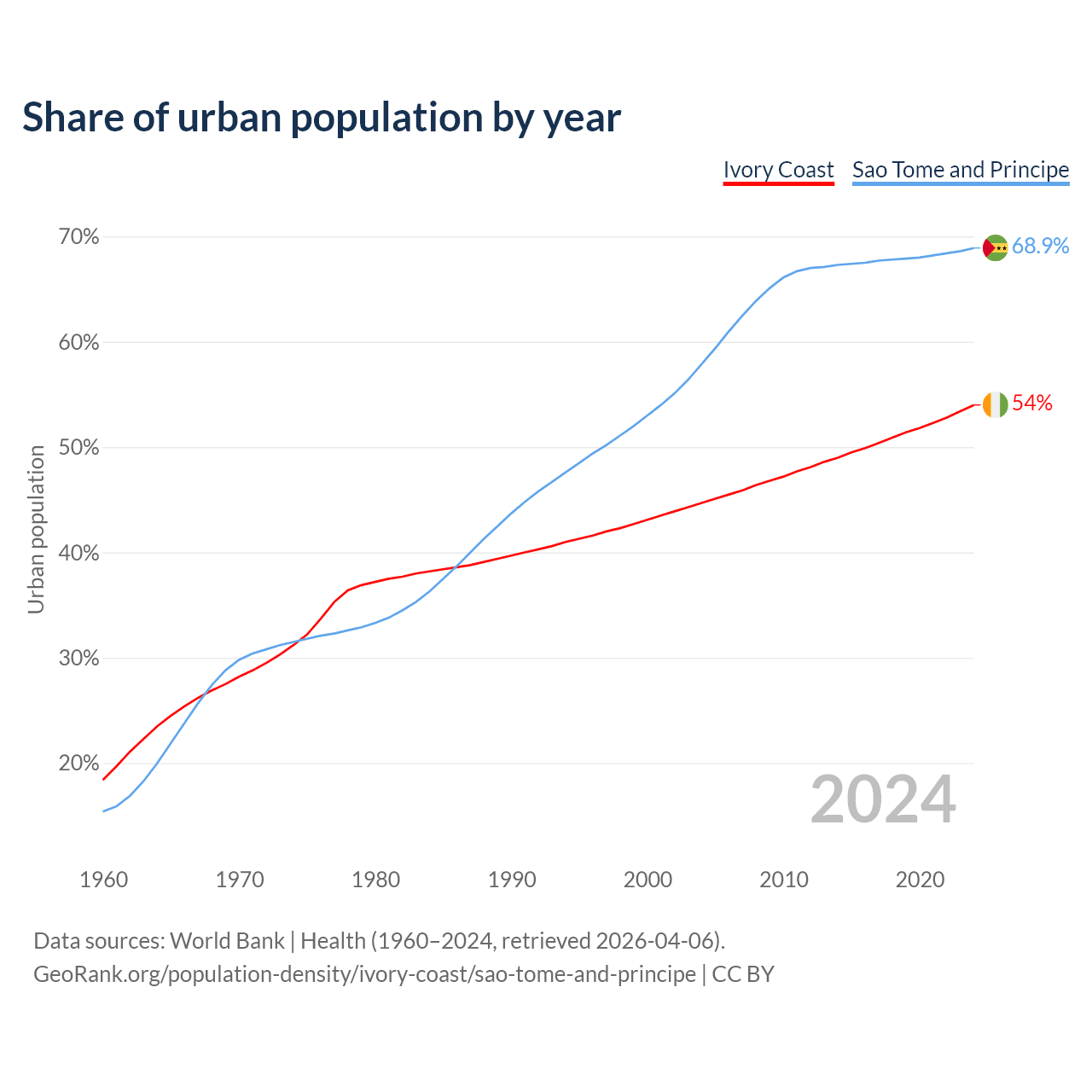 From 2004 to 2024, the share of urban population changed from 44.7% to 54% in Ivory Coast and from 57.9% to 68.9% in Sao Tome and Principe.