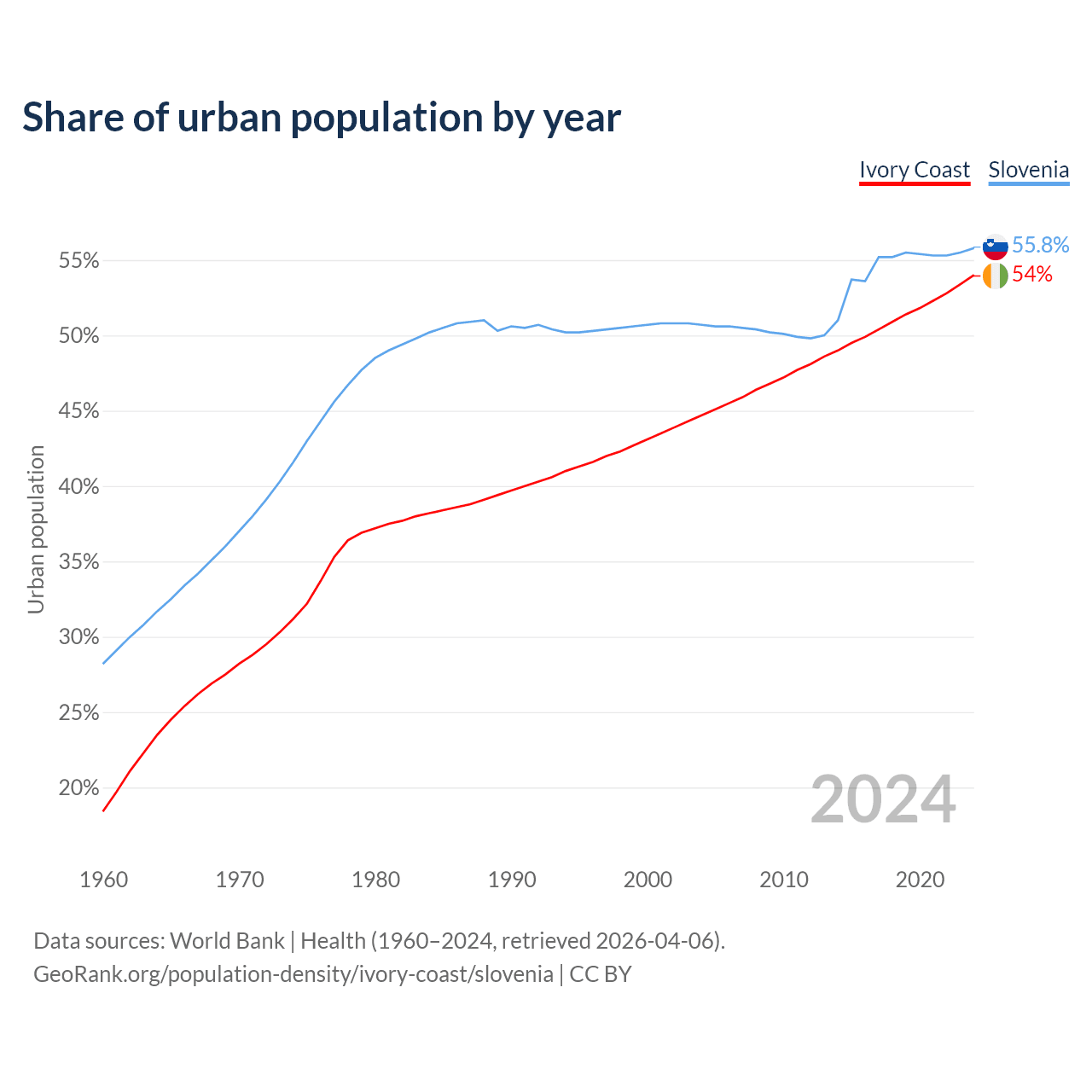 From 2004 to 2024, the share of urban population changed from 44.7% to 54% in Ivory Coast and from 50.7% to 55.8% in Slovenia.