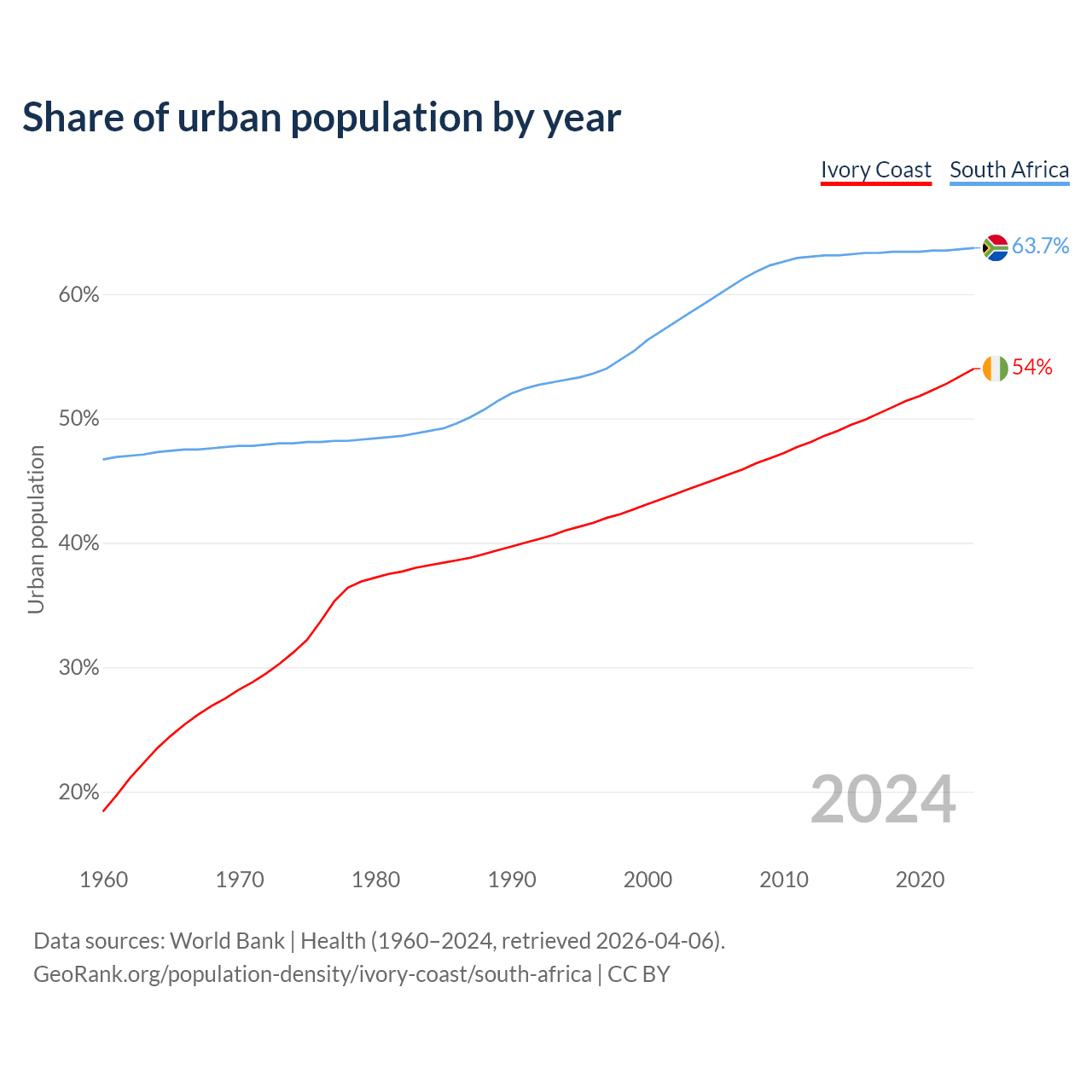 From 2004 to 2024, the share of urban population changed from 44.7% to 54% in Ivory Coast and from 59.1% to 63.7% in South Africa.